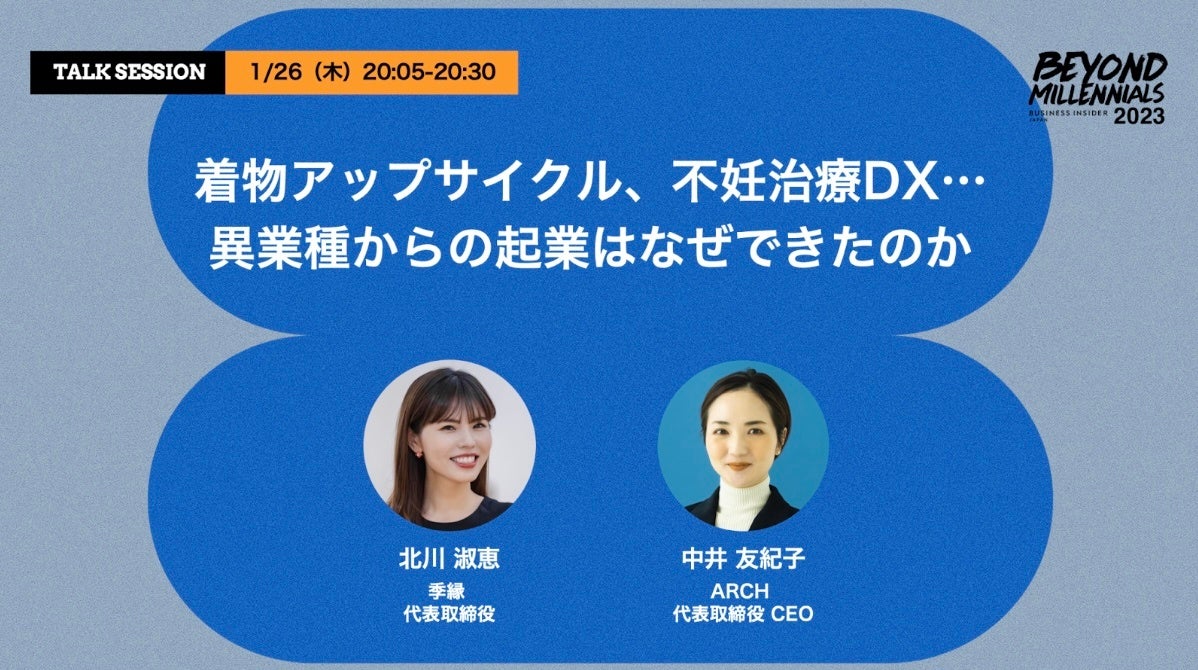 医療とテクノロジーを融合した不妊治療専門クリニック 「torch clinic(トーチクリニック)」をDX支援する株式会社ARCH(本社:東京都中央区)の代表取締役CEO 中井友紀子が、Business Insider Japanが主催するミレニアル世代・Z世代の挑戦者を応援・表彰する「BEYOND MILLENNIALS(ビヨンド・ミレニアルズ)2023」 AWARDにて選出されたことをお知らせいたします。2023年1月26日(木)・27日(金)には、アワード開催を記念し、受賞者をゲストに迎えたイベントが開催されます。代表の中井は、受賞者の北川淑恵氏と1月26日(木)20時頃より登壇し、「異業種からの起業はなぜできたのか」というテーマにて対談致します。<イベント情報>https://event.businessinsider.jp/