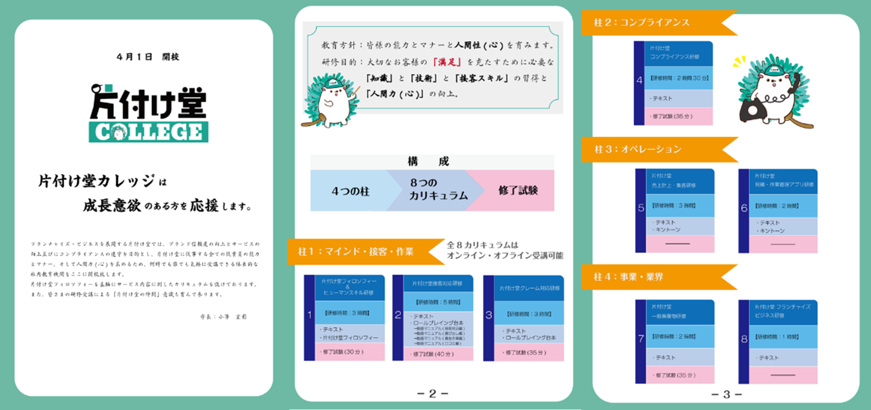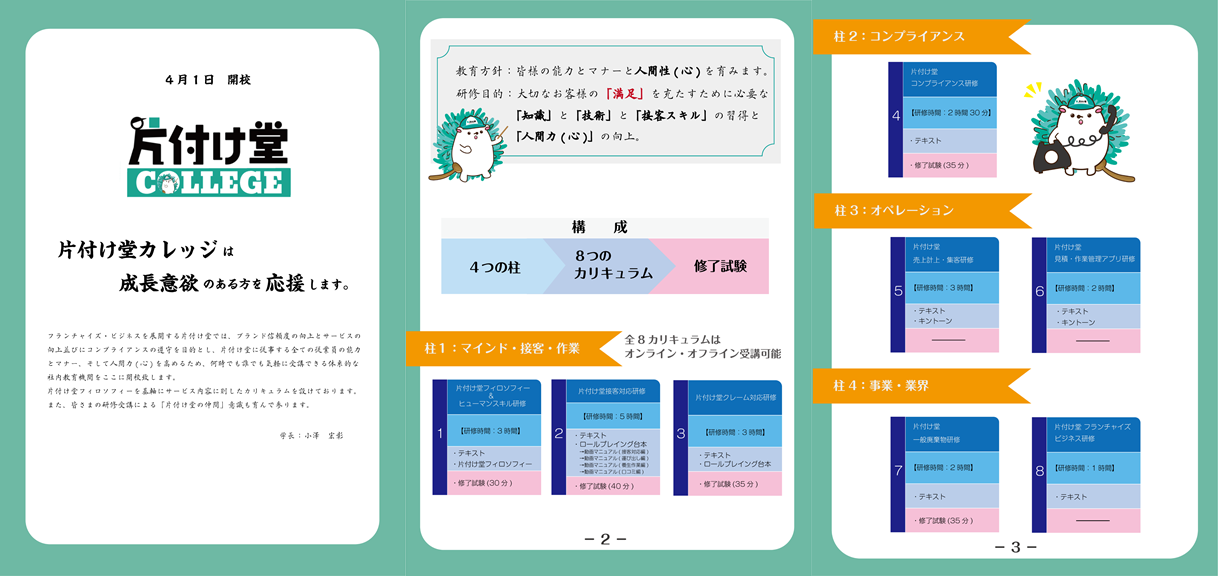 片付け(不用品回収・ゴミ屋敷清掃・遺品整理 等)事業の世の中のニーズが高まるなか、属人性の高いサービス業を営む上でコアの部分である”接客技術・施術技術・コミュニケーションスキルの向上”は不可欠と捉えております。また、「フランチャイズビジネス=教育ビジネス」と謳われており、片付け堂の”ブランド信頼度向上、顧客サービスの向上 並びに コンプライアンスの遵守”についての教育・研修を目的とした機関として、「片付け堂カレッジ」の開校を進めてきました。