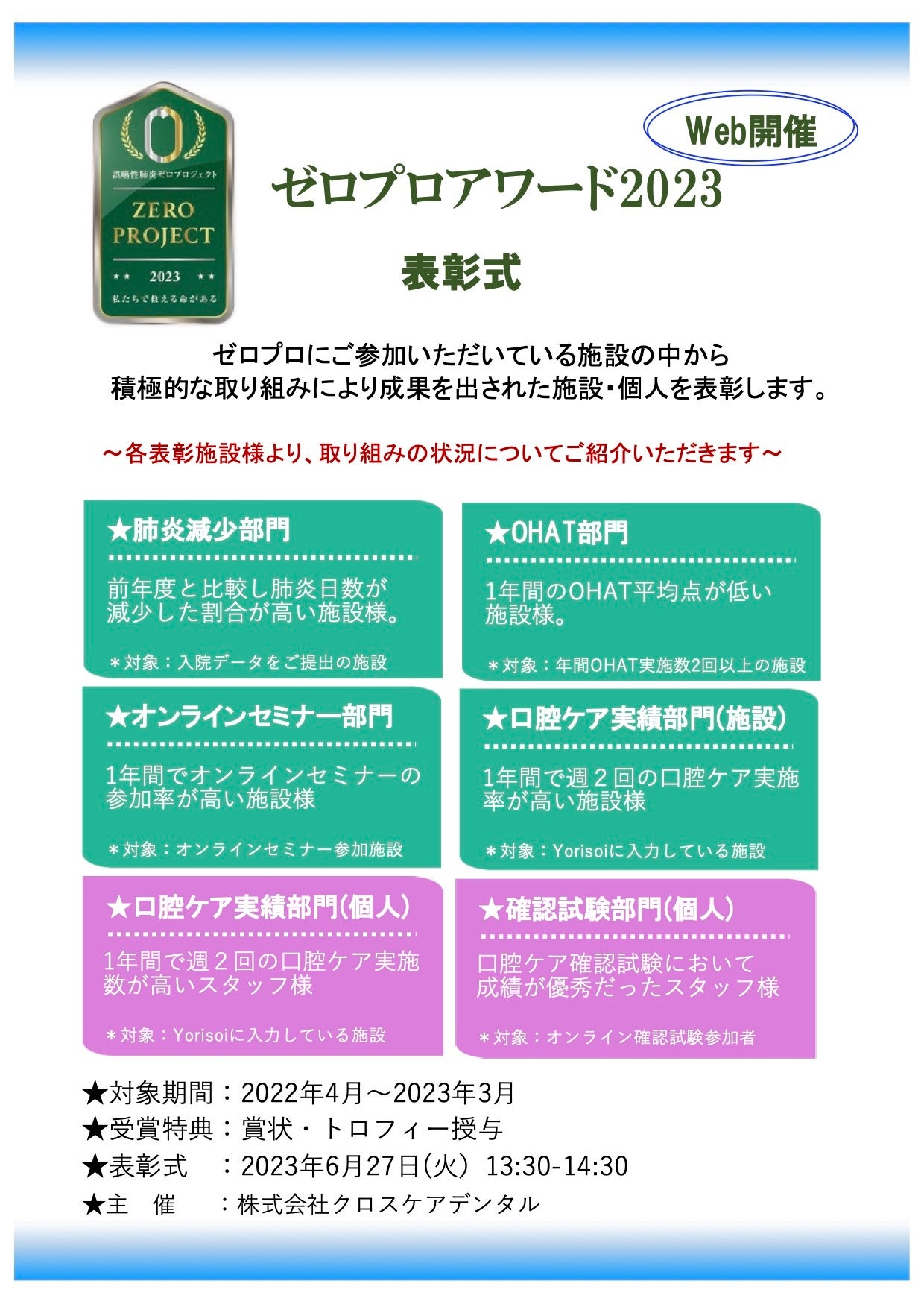 介護者による口腔ケアで高齢者の誤嚥性肺炎ゼロを目指している株式会社クロスケアデンタル(所在地:福岡市、代表取締役:瀧内博也、以下、当社)は、当社が推進している「誤嚥性肺炎ゼロプロジェクト®(以下、ゼロプロ)」において成績優秀事業者および個人を表彰する試みとして「ゼロプロアワード2023」を開催します。ゼロプロアワードは、誤嚥性肺炎ゼロプロジェクトの普及と良質な介護事業所の見える化を目的に立ち上げられ、昨年の初開催に続き2回目の開催となります。2022年4月1日~2023年3月31日までの実績を基に優秀事業者および個人を表彰します。