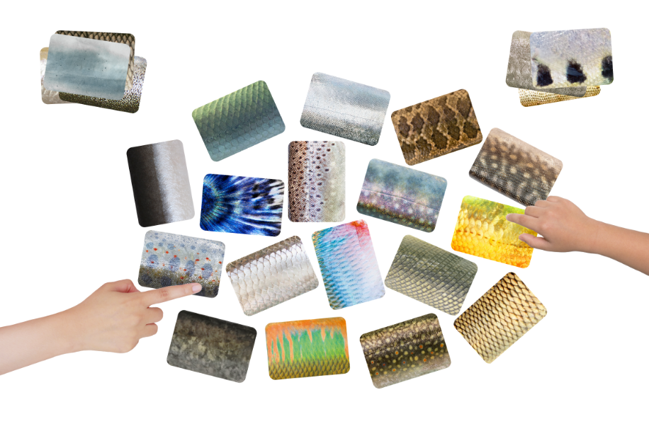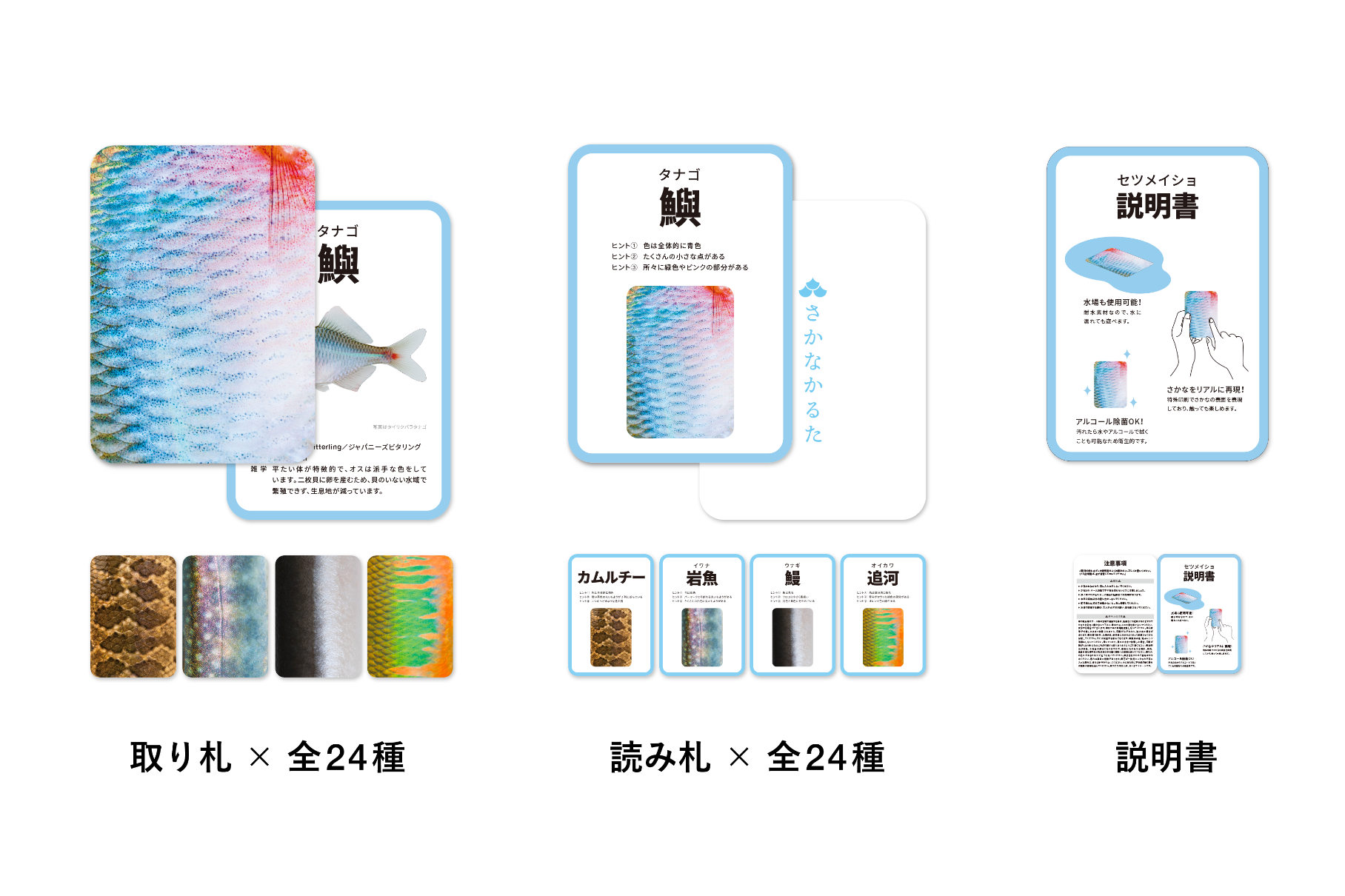 「さかなかるた」は、魚のキラめき感やウロコの凹凸を特殊な印刷技術で再現した、魚の表面のみで何の魚かを当てる、魚の美しさを楽しむかるたです。