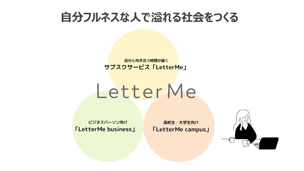 株式会社LetterMeは、自分フルネスな人で溢れる社会の実現を目指し、自分に向き合う時間が届くサブスクサービス「LetterMe」、ビジネスパーソン向け「LetterMe business」、高校生・大学生向け「LetterMe campus」を展開しています。