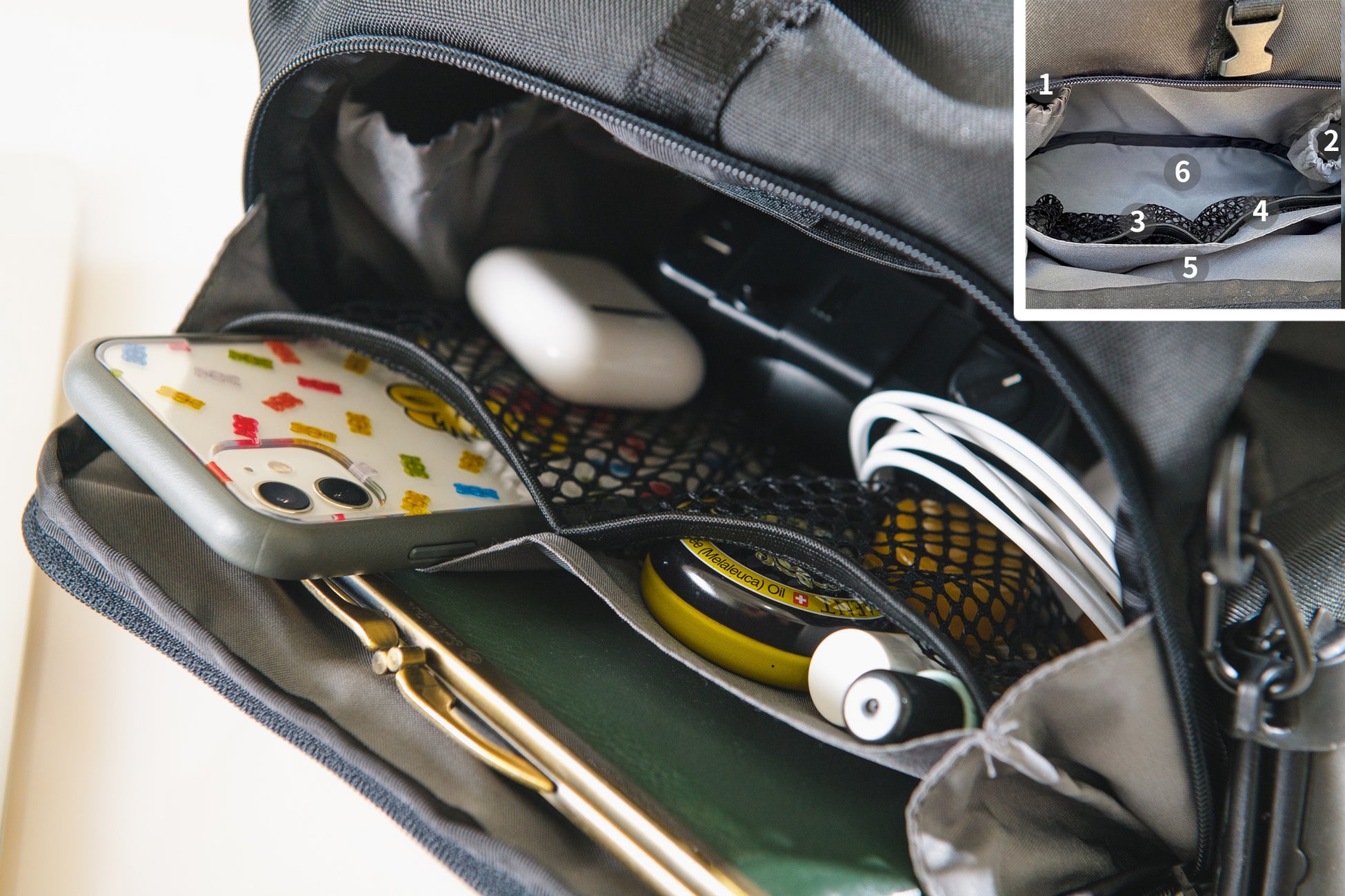 普段手にするバッグのお悩みの中で、多いモノの1つとして「必要なものをすぐに取り出せない」というものがあります。Rollite多機能5WAYバッグは、そんなお悩みを解消するかのように合計9か所の収納スペースを用意。
