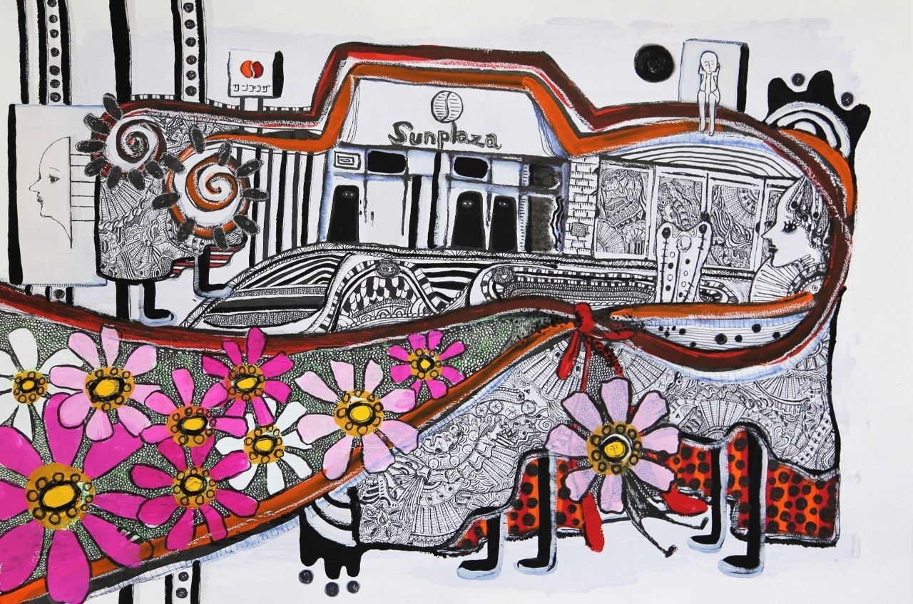 そのサンプラザの象徴的なファサードが、シンボルカラーのオレンジのラインを強調する形で描かれ、町の方々の楽しい想い出が、浪江の花コスモスで表現されています。