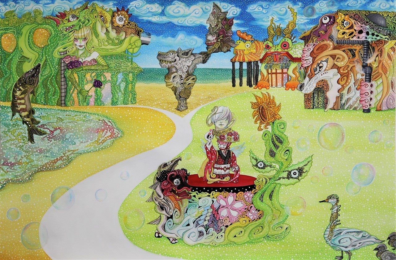 第四弾アートの「なみえの未来」のテーマは「賑わいと住みやすさが同居するまち」。浪江町がかつての賑わいを取り戻す一方で、お年寄りも子供もハンディキャップを持つ方も、誰もが住みやすく安心して住み続けられるまちを自分たちの手で創りたい。そんな町のみなさんの願いからインスピレーションを得て、鮭やトルコギキョウ、獅子舞や田植え踊りなど、浪江のモチーフを散りばめながら、様々な人が集い楽しく遊ぶイメージが表現されています。