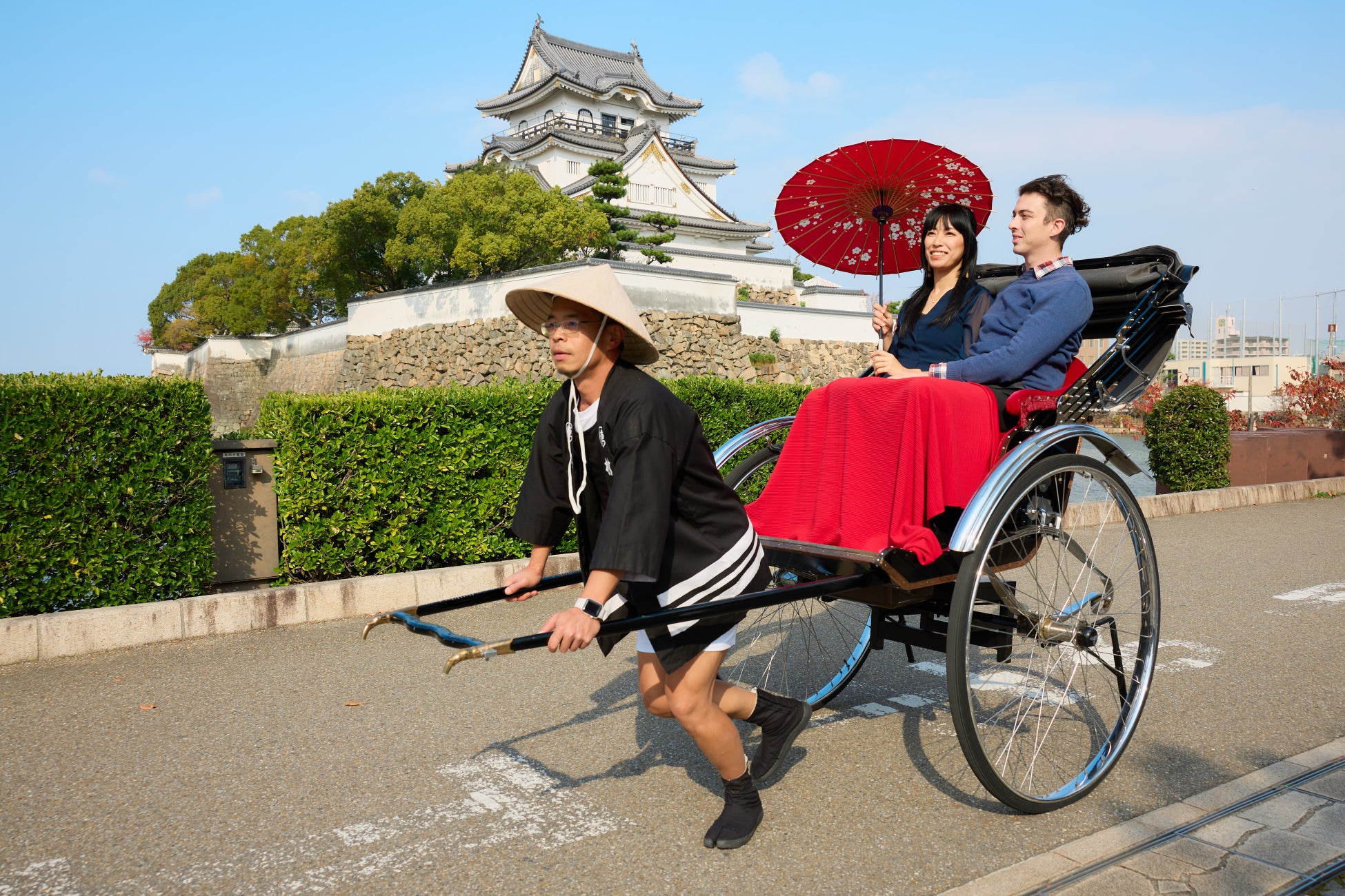 岸和田駅から車夫の案内で、時代の面影を残す紀州街道など、城下町の街並みを眺めながら岸和田城を目指します。岸和田で人力車に乗車できるのは、このツアーならではの体験です。