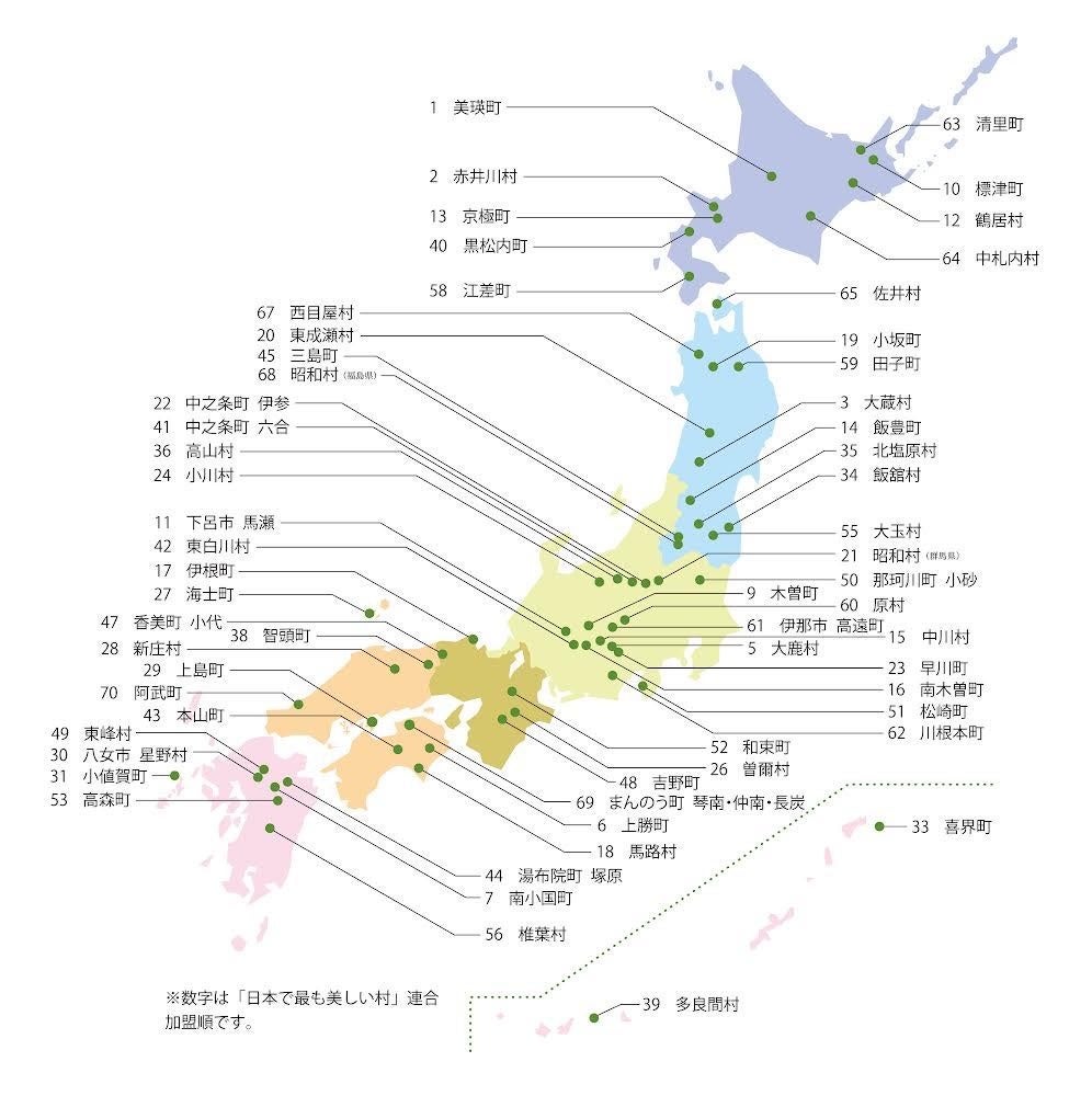 「日本で最も美しい村」連合は、「美しい村を、美しいままに。」をキャッチフレーズに、全国61の地方自治体・地域と、66社の企業サポーター(正会員)、230の個人・企業・団体(準会員)で構成されるNPO法人です。(2022年6月現在)