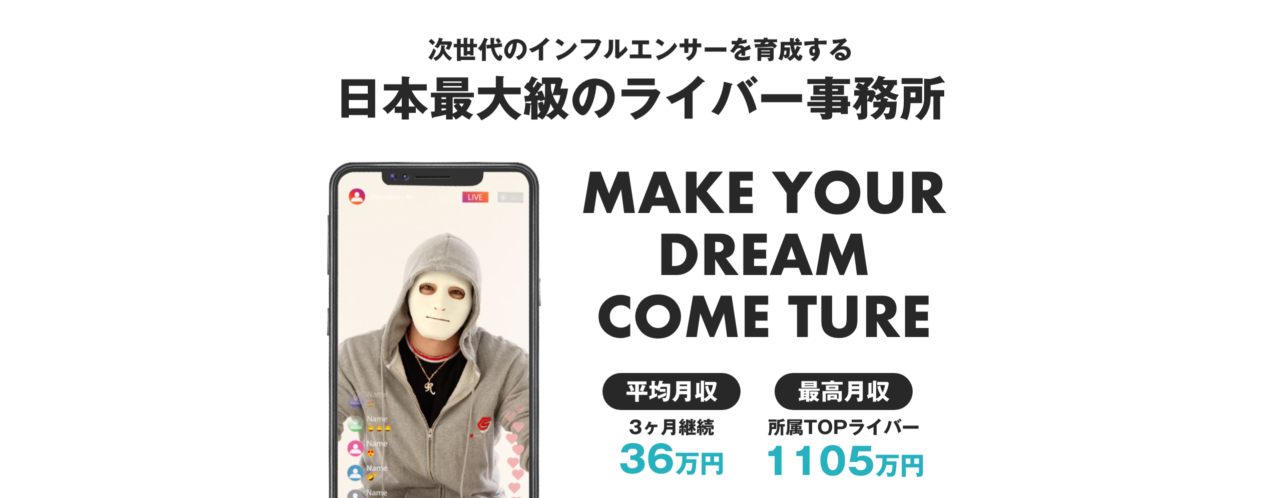 学生や主婦、会社員やインフルエンサーなど男女問わず多彩なライバーが6000名以上所属しており、様々な人気配信アプリで多数のTOPライバーを輩出しています。