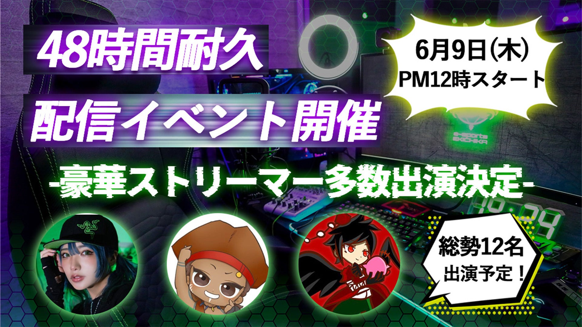 ホテルの2フロアを改装し、最新ハイスペックPC【RTX3090】のグラボを始め、全50台ものゲーミングPCを完備した、大阪長堀橋初となる大型e-sports施設【e-sports EKICHIKA】のプレオープンを記念し、EKICHKA代表後藤による、《絶対に寝てはいけない48時間耐久配信イベント》が2022年6月9日~11日に開催が決定致しました。この前代未聞となるイベントを盛り上げるために、勢○○名の豪華有名ストリーマー達とのコラボ配信や、一般参加型によるゲーム配信を予定。よりイベントを盛り上げる為に、プロ実況者による本格生配信を実施致します。タレントやVTuber、プロゲーマーなど様々なジャンルの方達が一度に集う今までにない最高のイベントを是非お楽しみください。