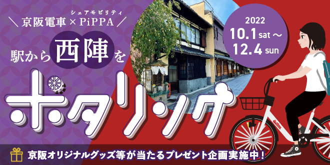 京阪電気鉄道株式会社(本社:大阪市中央区、社長:平川良浩)と株式会社Clew(本社:京都市下京区、代表取締役:西本統)は、西陣織工業組合および京都府、京都市が実施する「西陣呼称555年記念事業」と連携し、京阪電車とシェアサイクルPiPPAを活用した沿線のポタリング観光企画「駅から西陣をポタリング」を2022年10月1日(土)から12月4日(日)まで実施します。