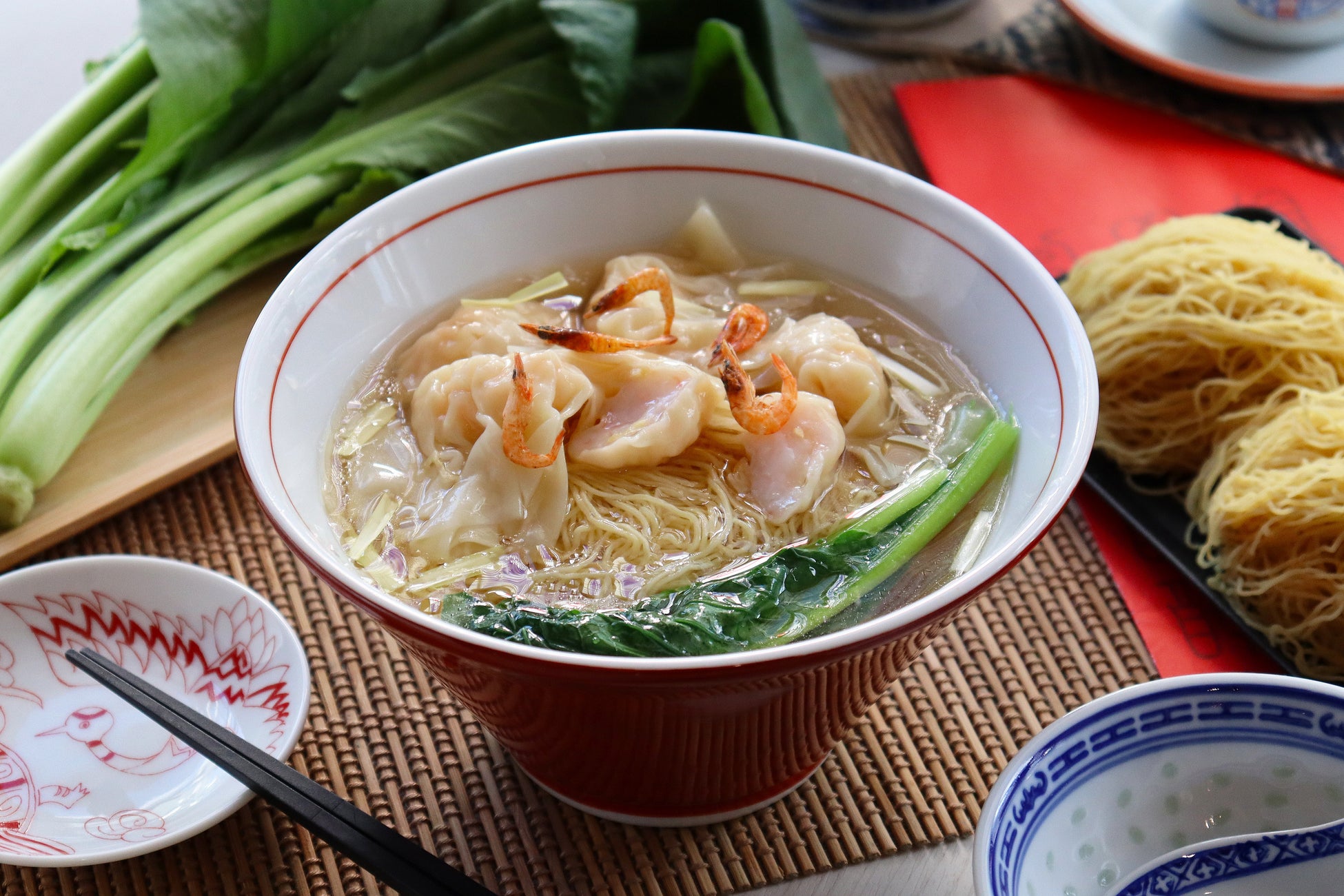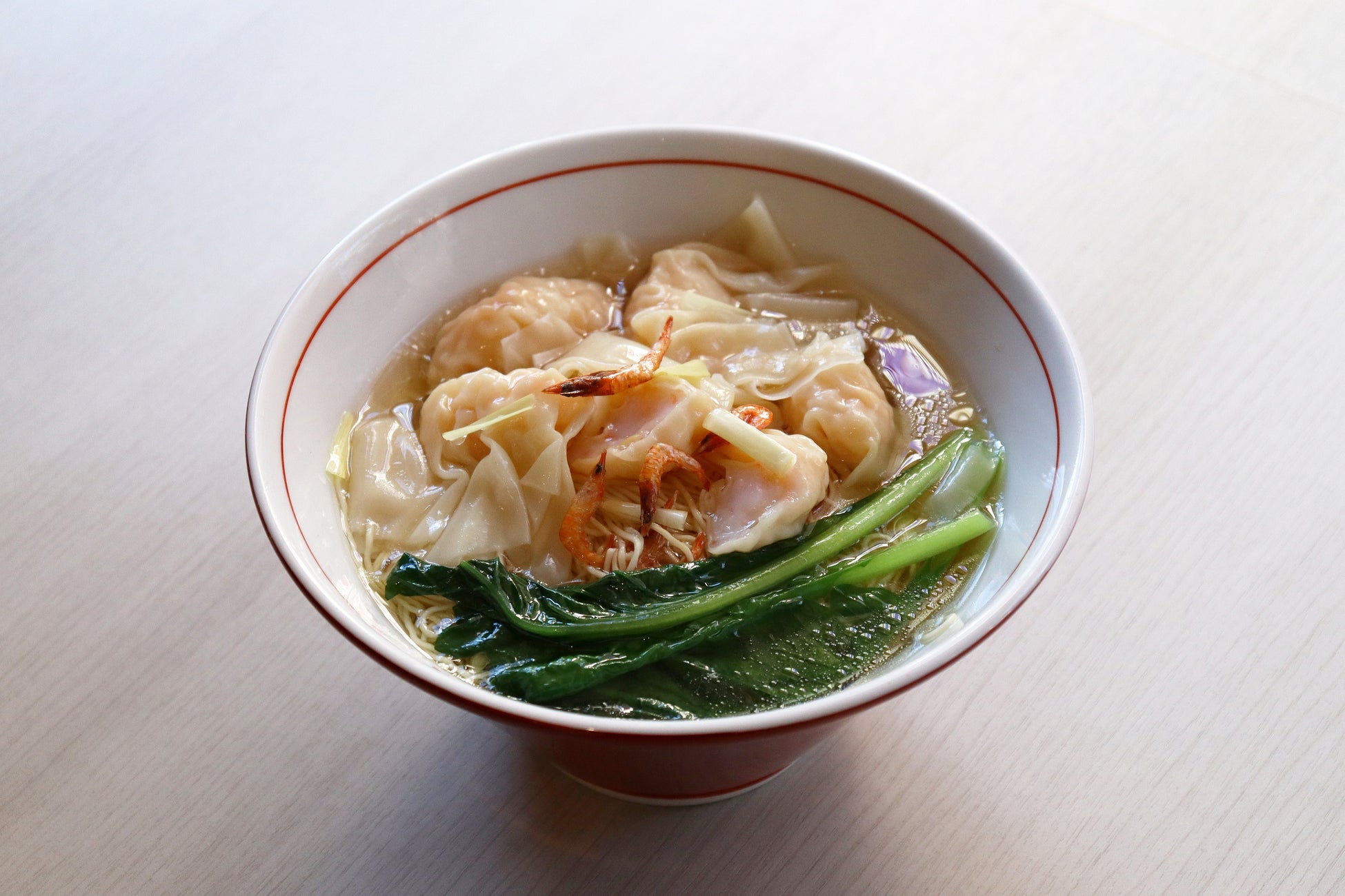 香港グルメの代表料理「香港海老ワンタン麺」。しっかりとしたコシのある極細麺と、透き通るあっさりスープ。そして1番の魅力は、海老がゴロっと入ったプリプリの「海老ワンタン」です。