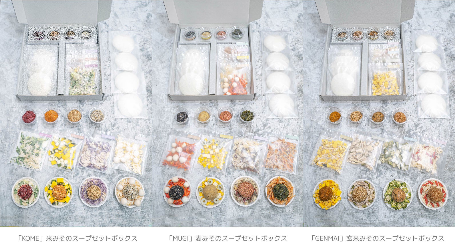 MISONOMIオンラインストアでは、季節のスープ「オータムンフラワー」も楽しめる米みそスープセットほか3種のみそをつかったスープセットボックスの購入が可能です。