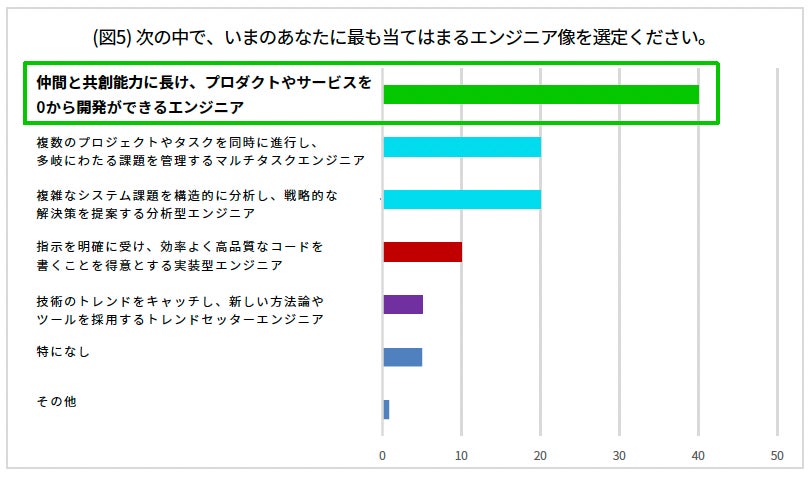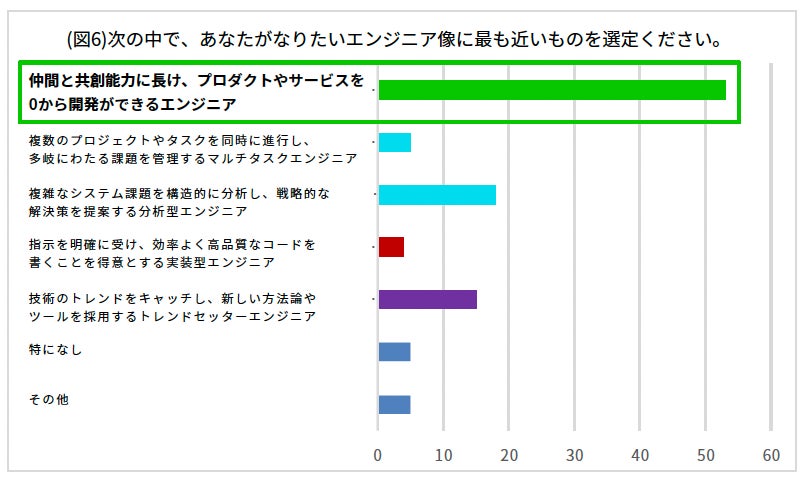 「IT業界で躍進し続ける企業のエンジニアの40%が『仲間と共創し、プロダクトやサービスを0から開発できる』と自認しています(図5) 。また、53%がなりたいエンジニア像であることがわかりました。一方、全国のZ世代エンジニアにおいて現状自身が当てはまると考えているのは10.5% (図6) にとどまりました。