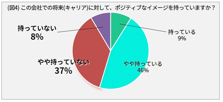 一方で全国のZ世代エンジニアを対象に行なった調査では、「やりがいを感じている」「やや感じている」と回答したのは52%にとどまり(図3) 、「やりがいを感じている」と断言した割合は1割である事がわかりました。さらに自身の将来についてポジティブなイメージを持っている割合も同様に3割以上差がつく結果となりました(図4)。やりがいを感じていると回答したエンジニアは「新しい事にチャレンジする機会が多いから」と答えたのが23.6%、「社内の成長機会が豊富だから」という理由が20.2%と答えたのに対し、やりがいを感じてないと回答としたエンジニアは自身の将来性への不安や新しい取り組みに参加できる機会の少なさが挙げられるなど理由にも大きな違いがありました。
