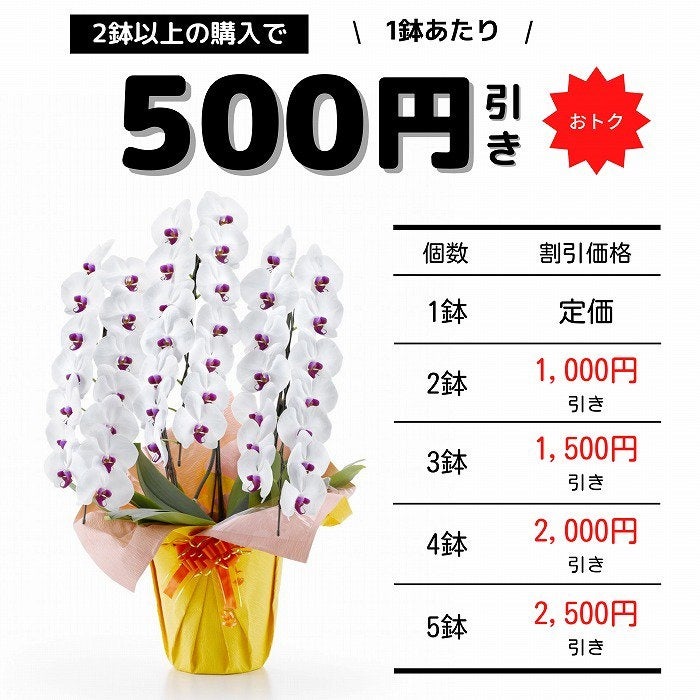 人気の胡蝶蘭は2鉢〜から1,000円割引が入り、以降買うごとにどんどん安くなる。