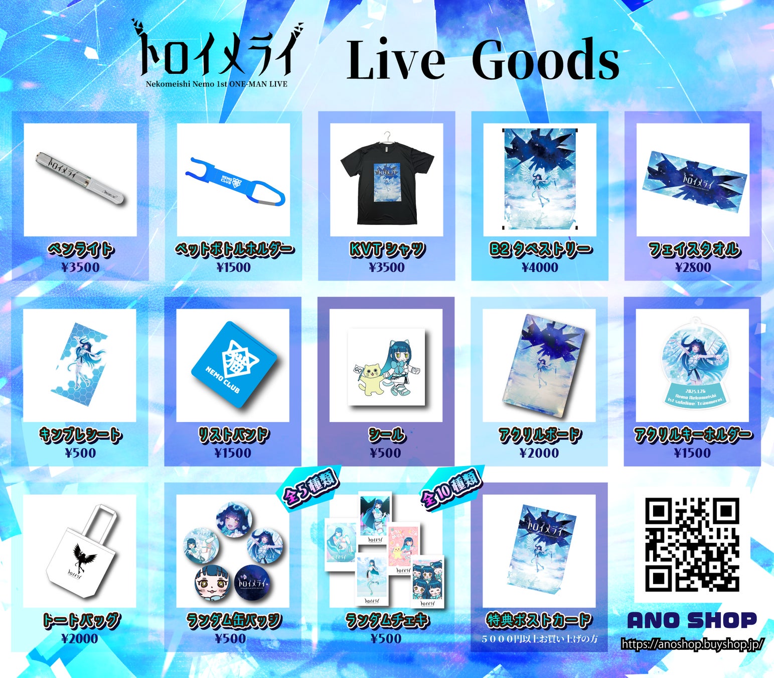 ライブで使用できるペンライトやタオルをはじめ、限定デザインのアイテムが多数ラインアップ。