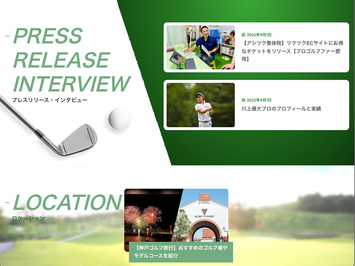 また、インタビュー・プレスリリース枠を上位部に掲載することで、ゴルフ事業者様の活動を告知しやすい形に。