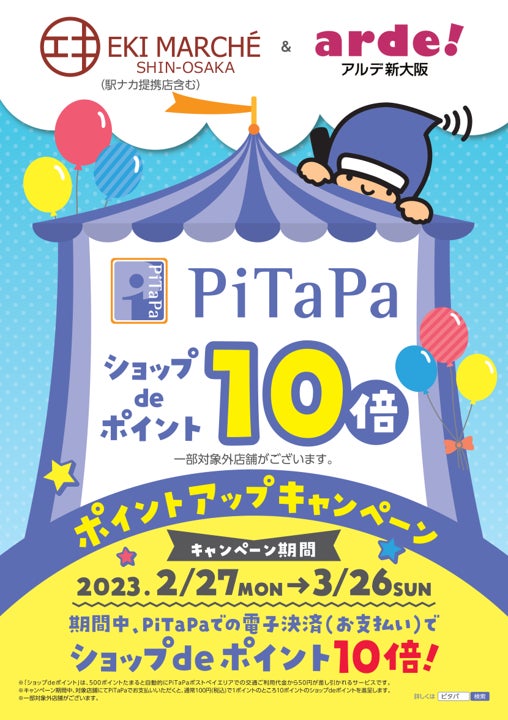 2月27日(月)~3月26日(日)までのキャンペーン期間中、アルデ新大阪でのお買物・お食事の際、PiTaPaで電子決済(お支払い)いただくと、「ショップdeポイント」が10倍になります!