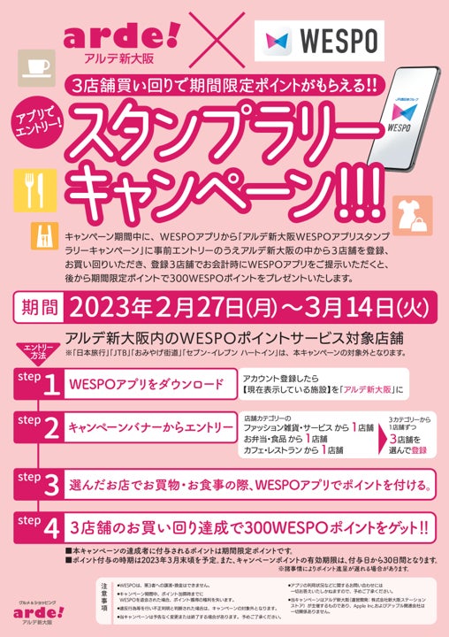 2月27日(月)~3月14日(火)までのキャンペーン期間中に、WESPOアプリから「アルデ新大阪WESPOアプリスタンプラリーキャンペーン」に事前エントリーのうえ、アルデ新大阪の中から3店舗を登録、登録した3店舗でお買い回りいただき、登録3店舗でお会計時にWESPOアプリをご提示いただくと、後日、期間限定ポイント「300ポイント」をプレゼント☆☆☆
