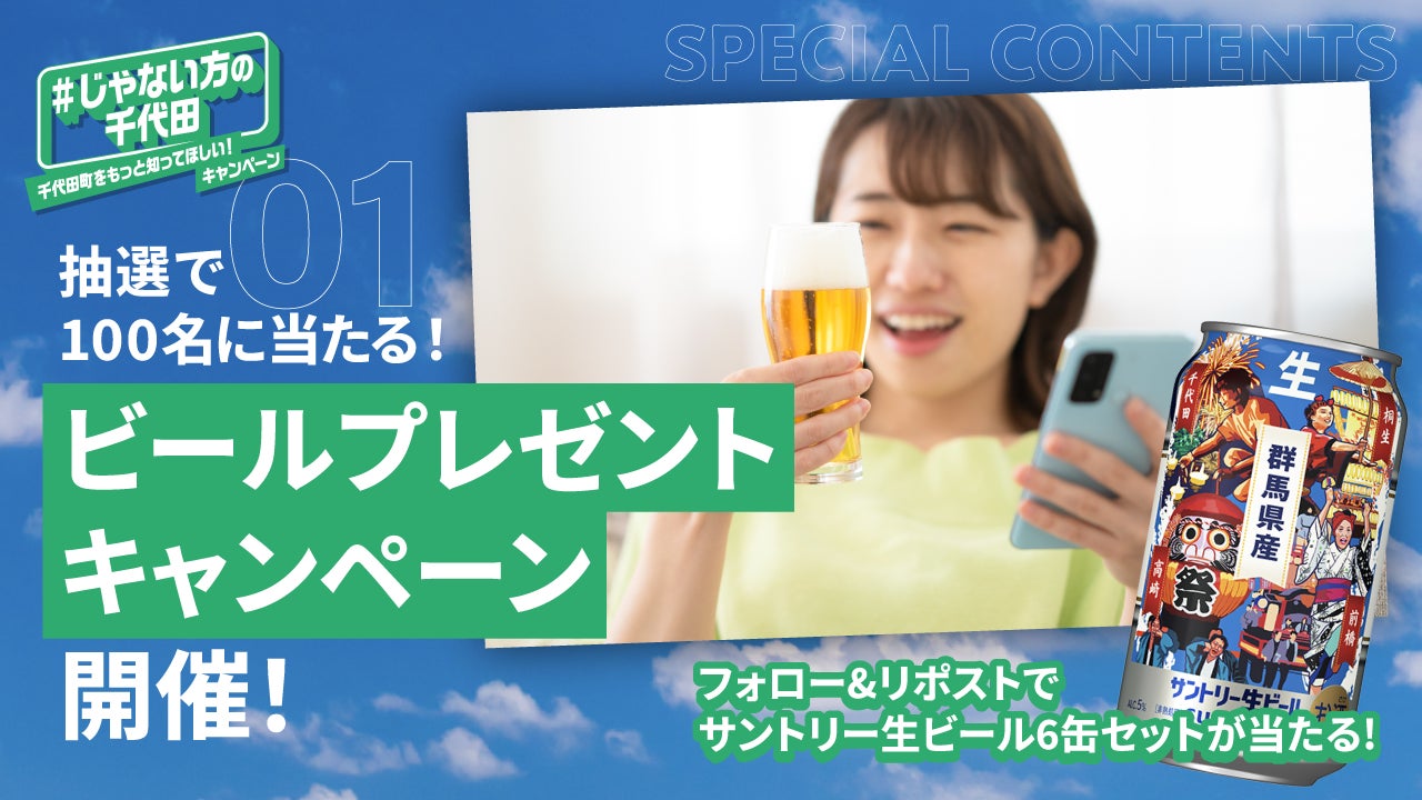 群馬県千代田町公式Xをフォローして、「#じゃない方の千代田」をつけて投稿、またはキャンペーン投稿をリポストすると、抽選で100名の方に群馬県産「サントリー生ビール」限定オリジナルデザイン6缶セットをプレゼントします。