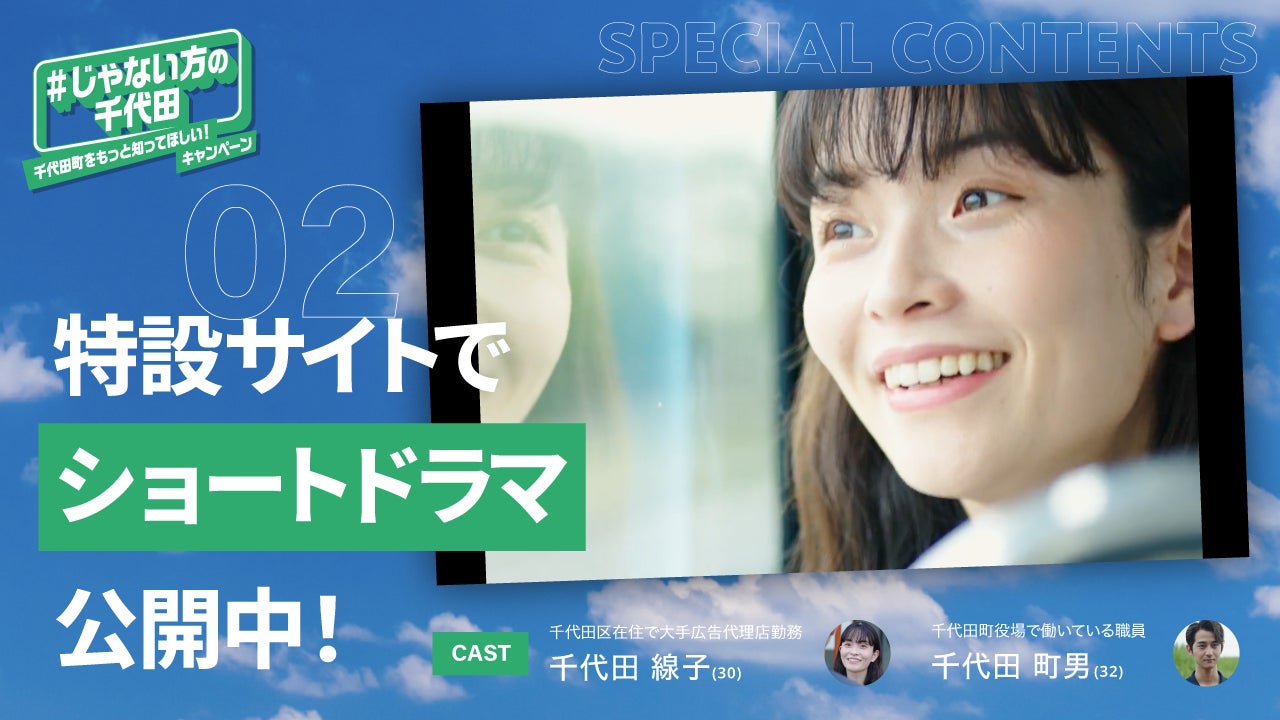 架空のキャラクター「千代田線子」と「千代田町男」が登場するオリジナルショートドラマを制作・配信します。物語は、都会から訪れた千代田線子が、町男の案内で千代田町をめぐる旅。地元のグルメや自然、人の温かさに触れるうちに、次第に心を動かされていく線子の姿を描きます。町男とともに歩む時間が、彼女に“じゃない方の千代田”の魅力を教えてくれます。