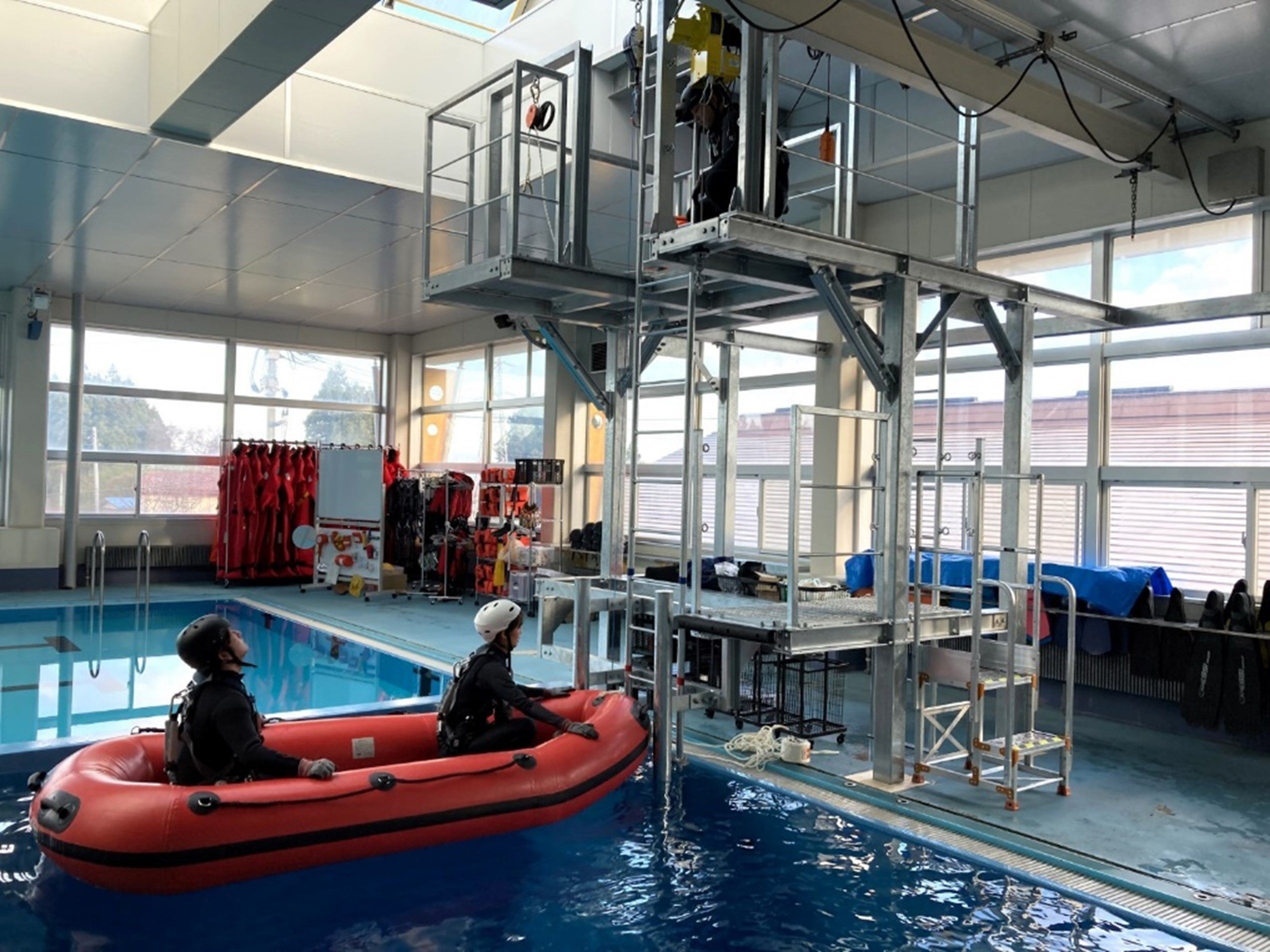 ▼開所に向けて実施しているデモ訓練の様子(作業員向け基本安全訓練の海上生存技術訓練)