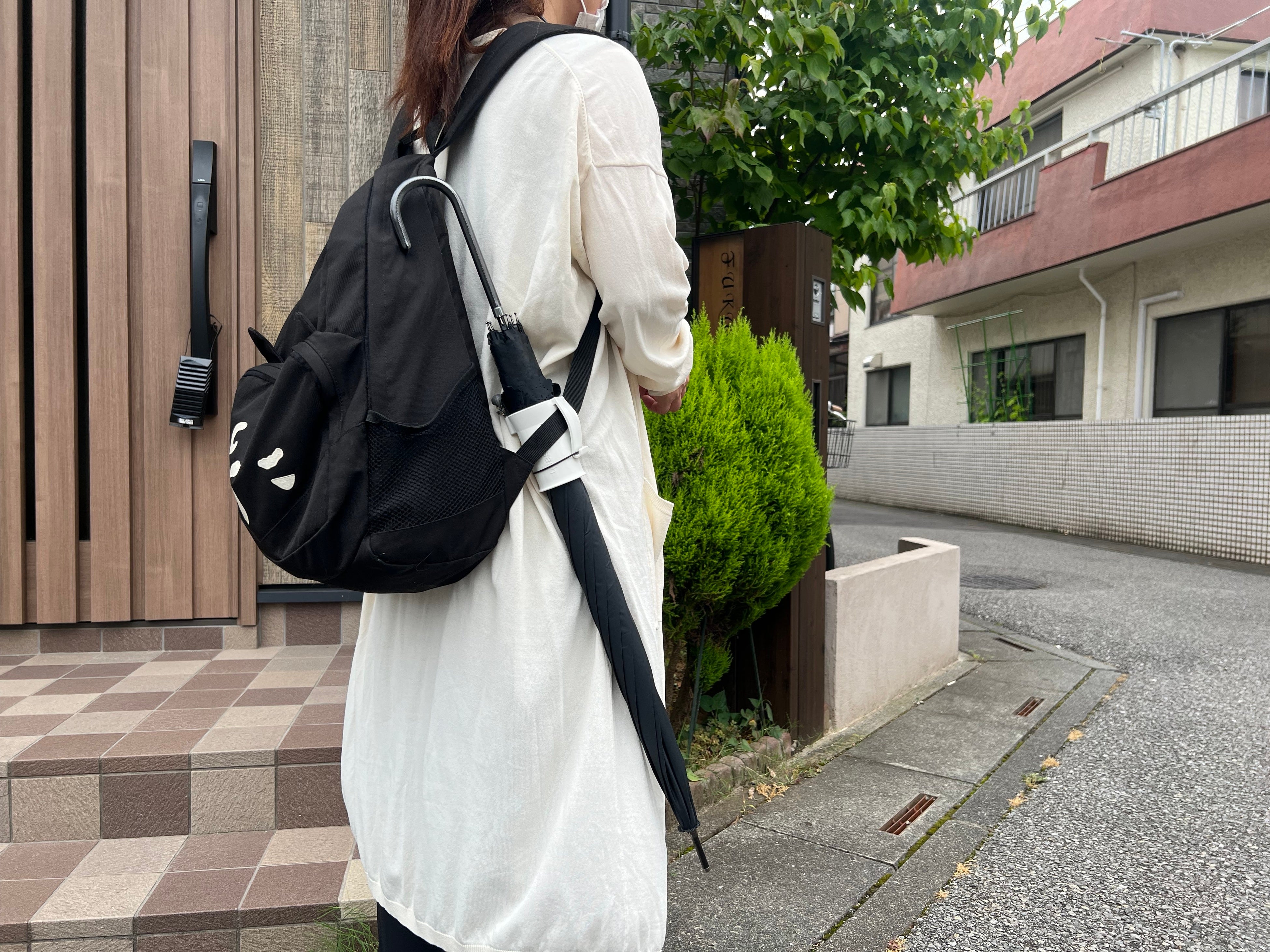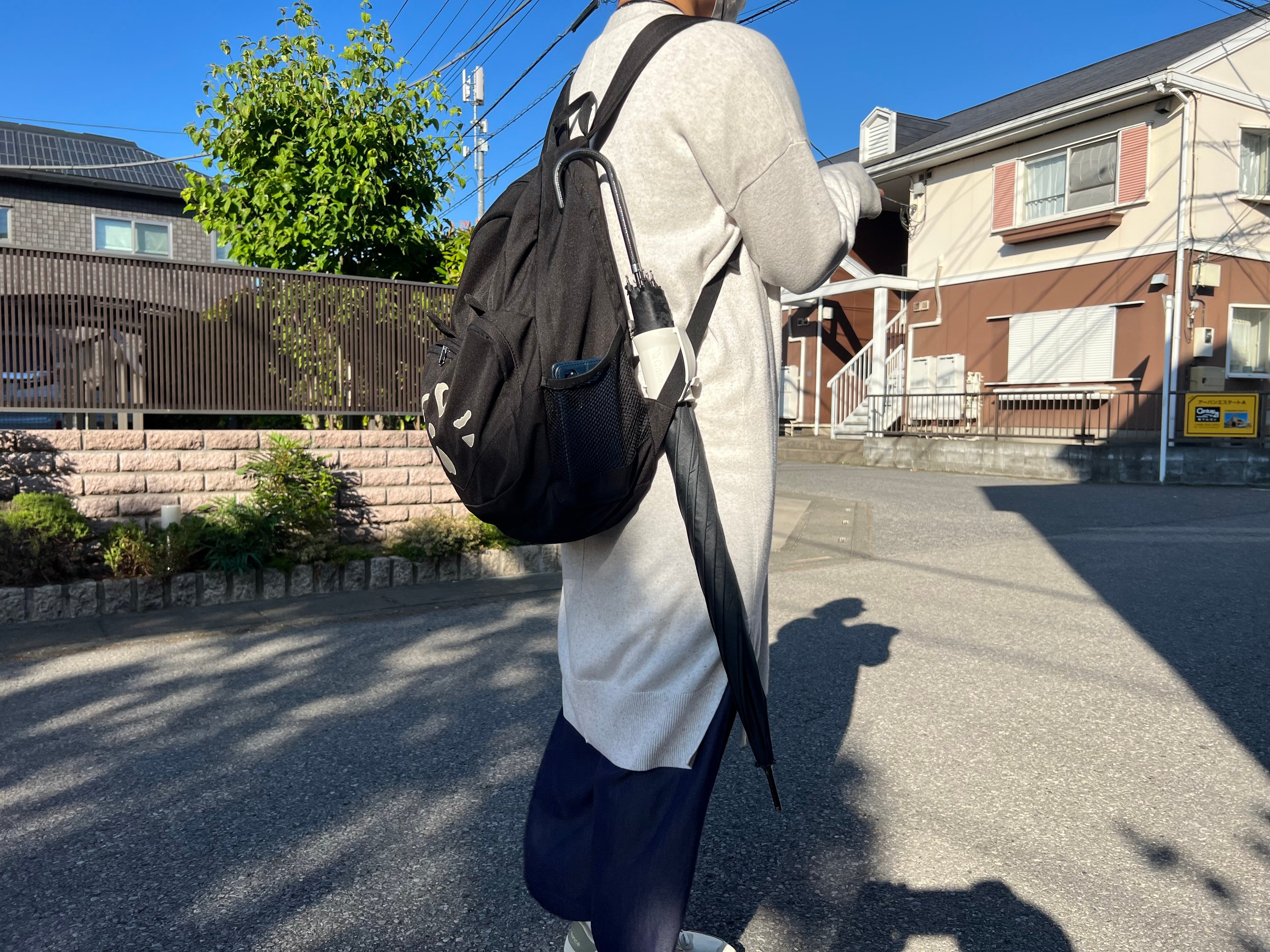 手を濡らさずに水を切る傘ホルダー!リュックに取付可能でハンズフリーを実現!