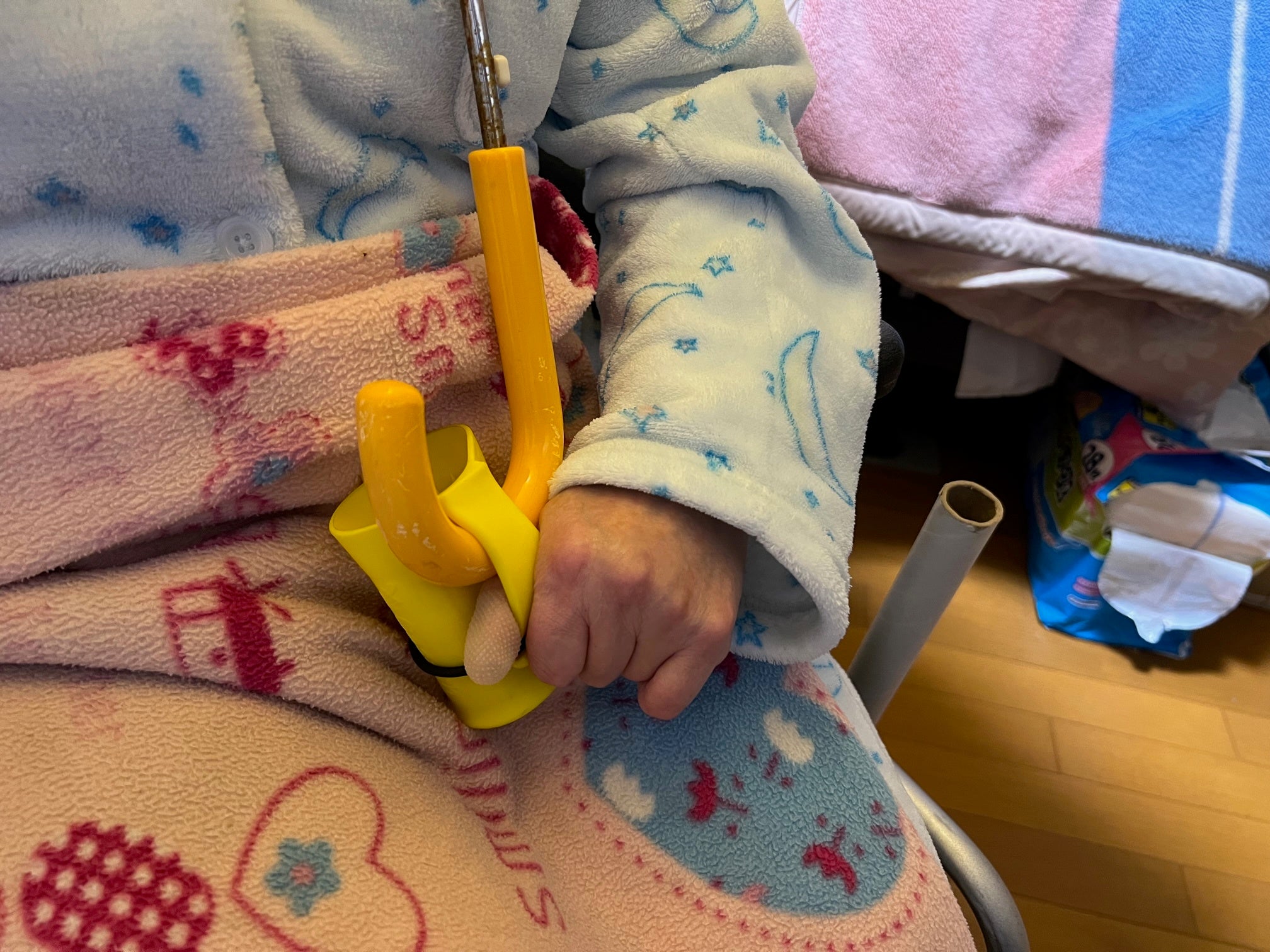《麻痺が残る手でも傘ホルダーを使う事で、傘を持つことも可能です》