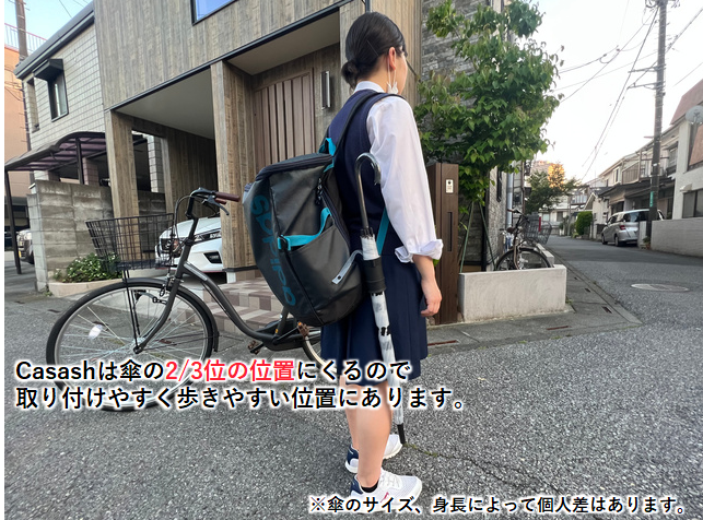 傘ホルダー【Casash】手を濡らさず綺麗にたたみ水滴を切り、リュックなどに取り付けて手ぶら移動…ブラッシュアップした特化した使い方!カサッシュECストア6月14日開始~