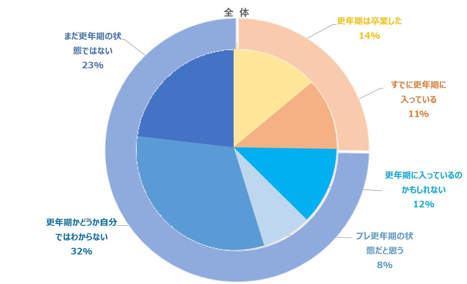 『更年期の自覚がある』というのは、「すでに更年期に入っている」「更年期は卒業した」、と回答をした人、『更年期かどうかわからない』を、「更年期にはいっているかもしれない」「プレ更年期の状態だと思う」「更年期かどうか自分ではわからない」「まだ更年期の状態ではない」と回答をした人とした場合、「更年期かどうか自分ではわからない」という方が75%も。更年期かどうかを知ることは、次のアクションへの機会になると思える。