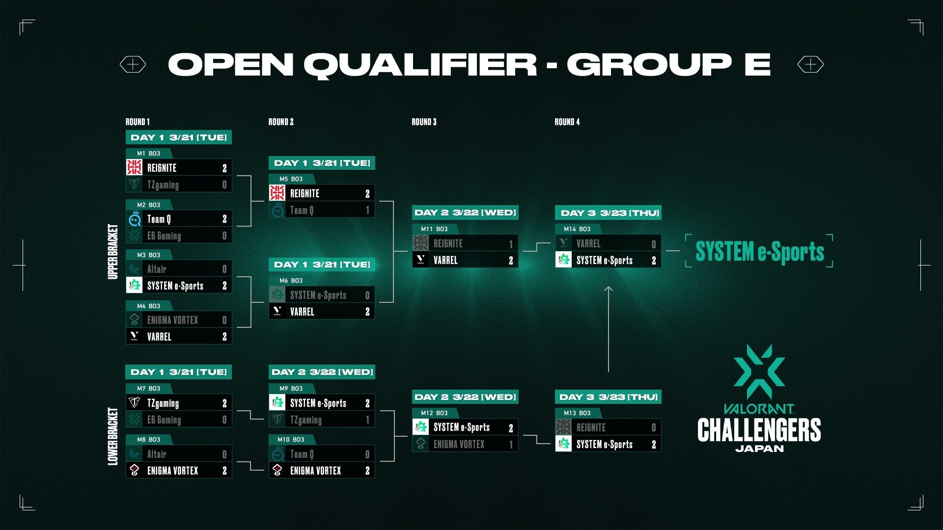 「SYSTEM e-Sports」は、1回戦を勝利し好スタートを切ったものの、2回戦で強豪「VARREL」にストレート負け。LOWERから予選突破を目指す形となりました。ここでも順調に駒を進め、決勝では強豪「REIGNITE」を下し、「VERREL」とのリベンジマッチへ。前回の敗北から体制を整え、見事ストレート勝ちAdvance Stageへと進出を果たしました。