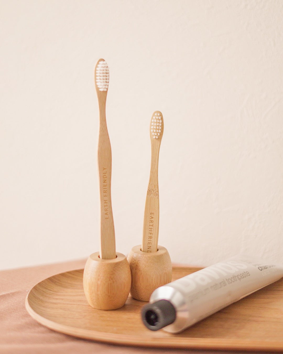 竹素材の柄と、ヒマシ油由来のバイオプラスチックのブラシからできた、竹の歯ブラシ。