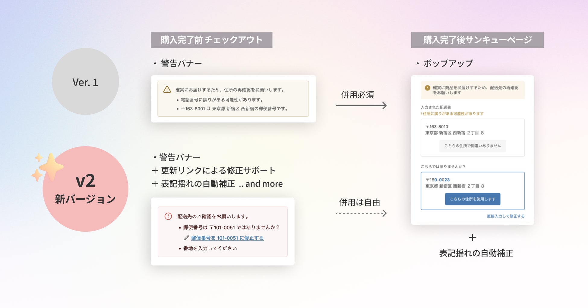 V2 ではこれらを、購入前のチェックアウト時に自動補正できるようになり、購入後の処理を併用せずに利用が可能になりました。これにより、ご利用の OMS や配送システムとの兼ね合いで購入後の住所更新では不都合が発生していたマーチャント様もお使いいただけるようになりました。