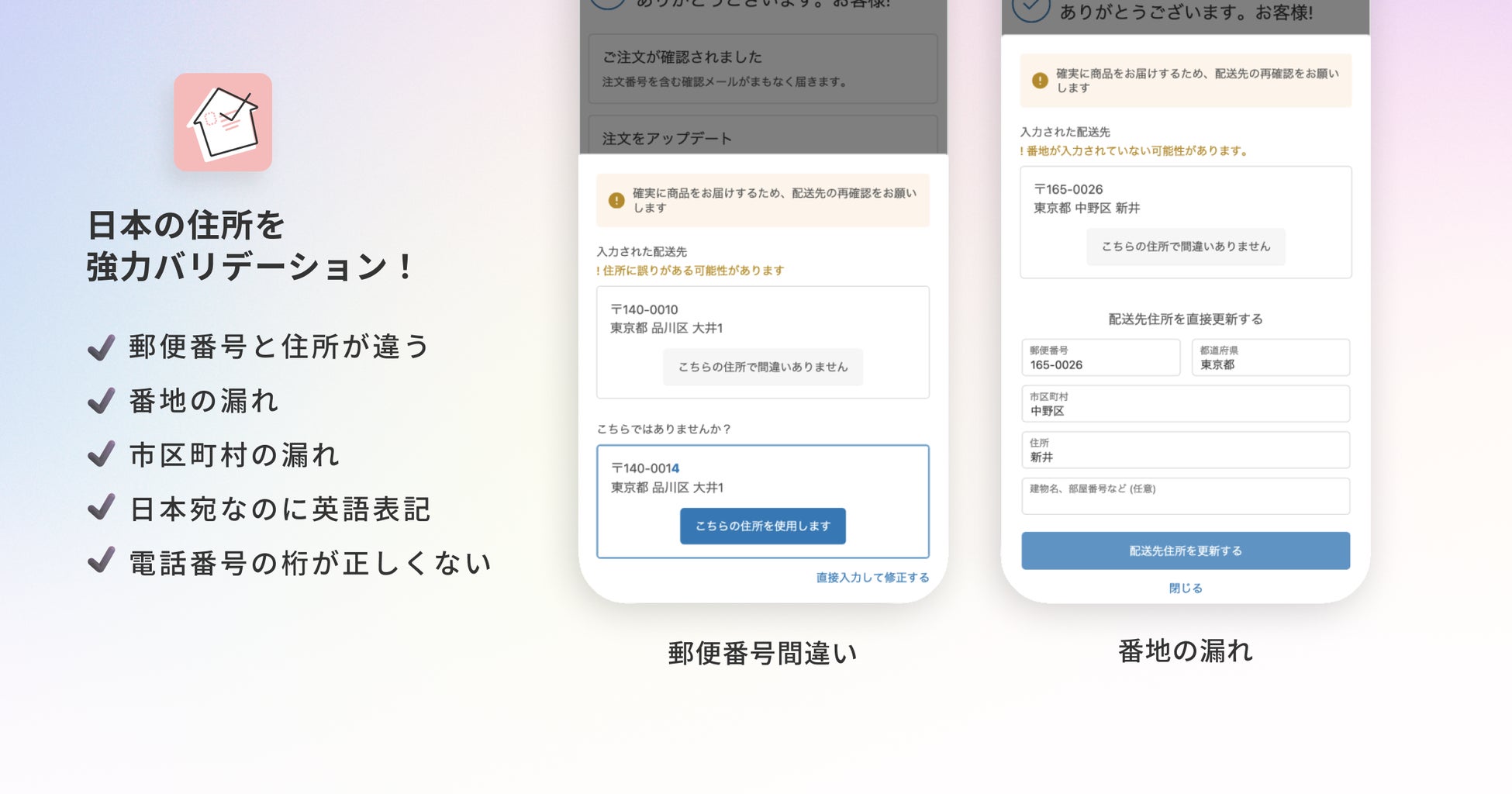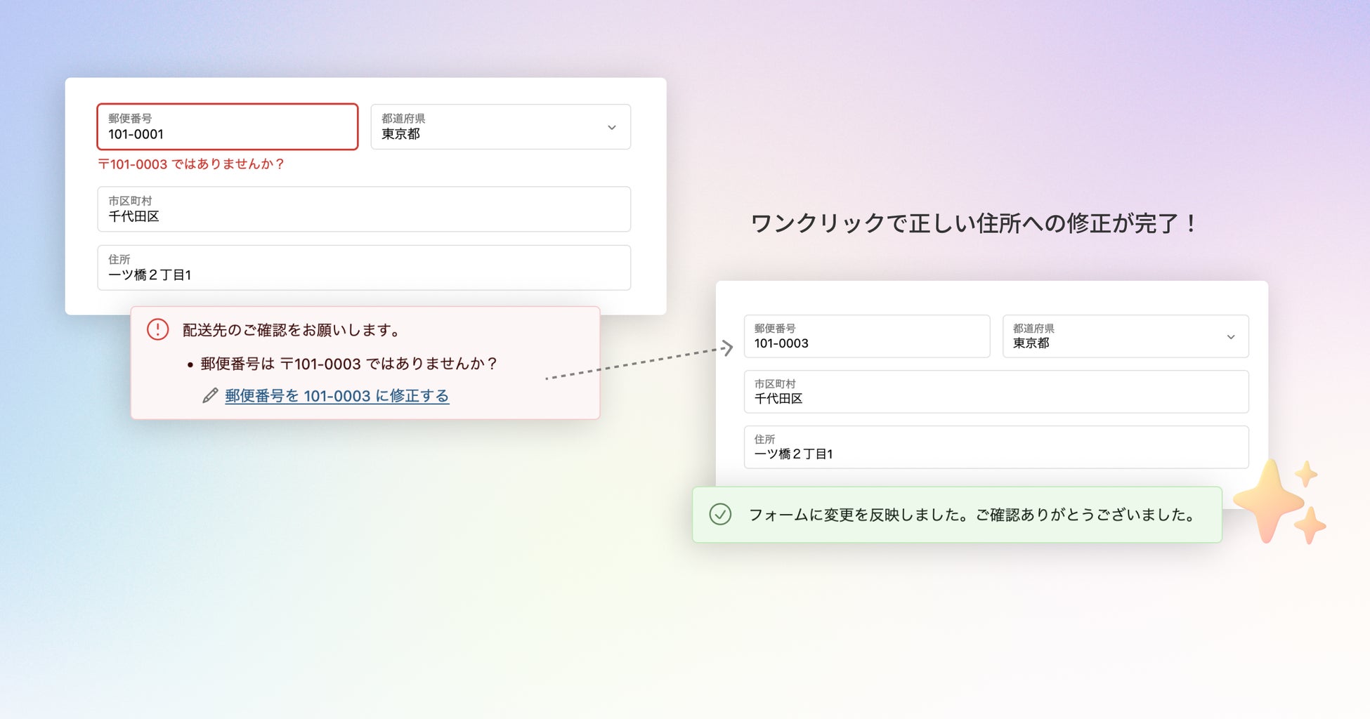 オンラインストアでお客様が配送先情報を入力する際、アプリが入力内容をリアルタイムにチェックし、不備をお知らせすることで、正確な配送先の入力をサポートする機能です。