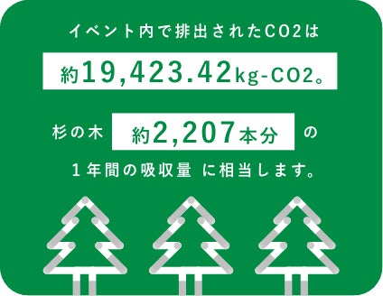 よりサスナブルなイベント開催を目指すため、参加者や運営チームによる移動、食事、宿泊、会場電力使用量をもとにCO2の排出量を算出しました。本イベント内におけるCO2排出量は、およそ19,423.42kg-CO2(推測値) 。 杉の木約2,207本が1年間に吸収するCO2量に相当します。今回の結果を踏まえ、イベント内におけるCO2排出量削減を徹底し、カーボンオフセットを目指していきます。