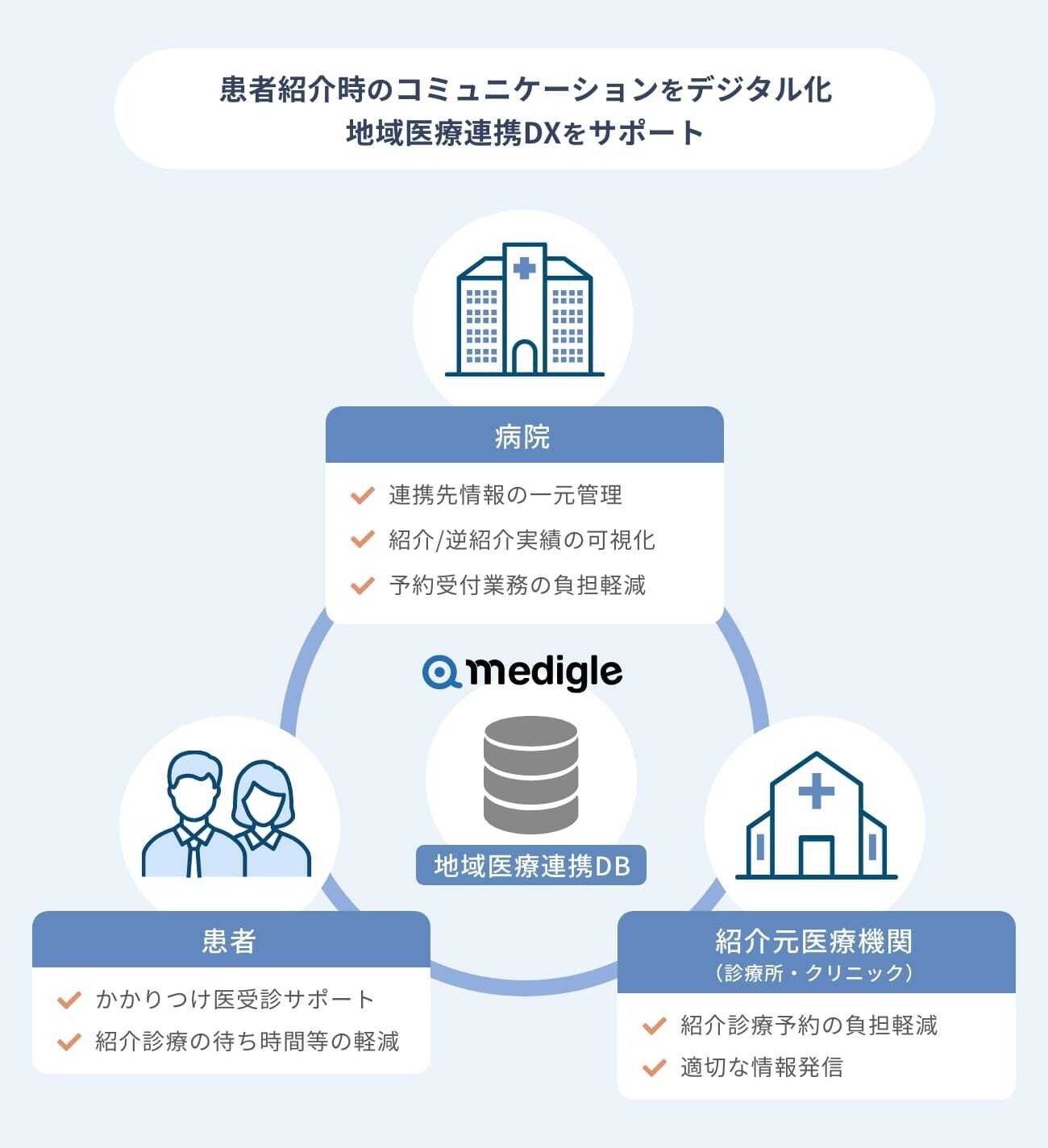 medigle(メディグル)は、患者紹介時のコミュニケーションをデジタル化し、患者紹介における業務負担を軽減し、医療者の方々が本来の専門領域に集中できる環境づくり、患者がスムーズに受診できる仕組みづくりをサポートしていきます。