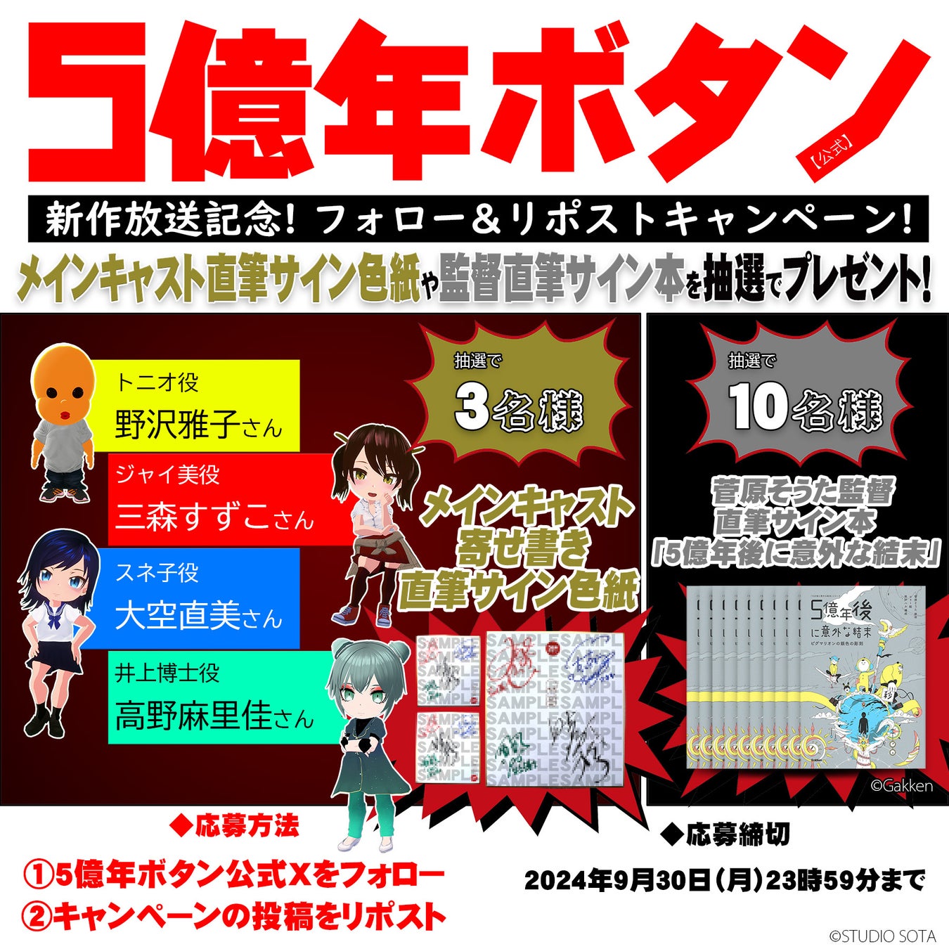 放送を記念し、アニメタイムズ公式YouTubeチャンネルにて「5億年ボタン」全12話一挙無料配信!豪華キャスト直筆サイン色紙や、監督直筆サイン本が抽選で当たる公式Xフォロー&リポストキャンペーン開催!