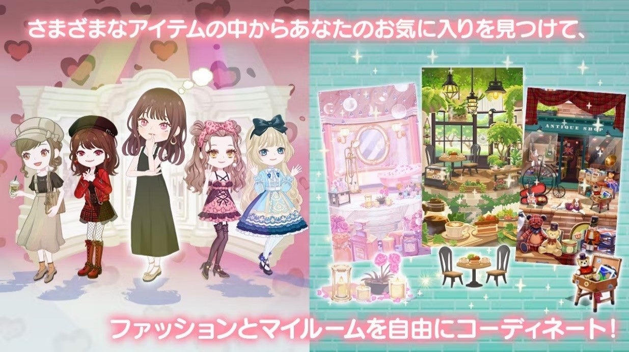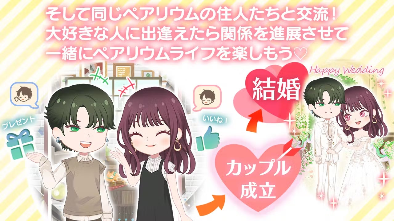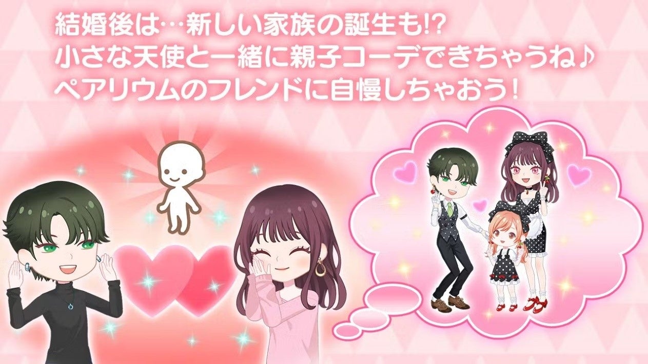 豊富な種類のアバターアイテムを使って、自分だけのアバターコーデを作成し、着せ替えや他のユーザーとのコミュニケーション、また「結婚」「出産」というイベントを仮想空間で楽しむことができます。