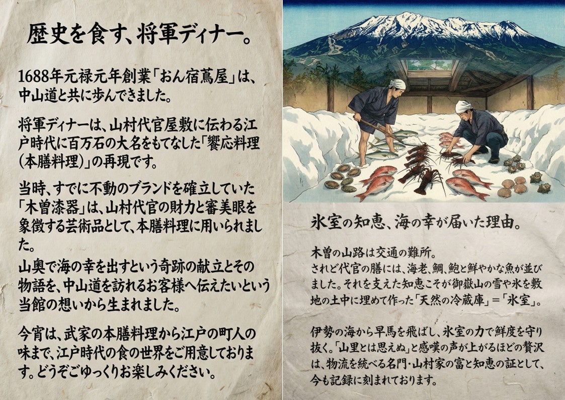株式会社つたや本店(本社:長野県木曽郡木曽町、代表取締役社長:津田美恵子)は、老舗旅館「街道浪漫 おん宿蔦屋(おんやど つたや)」(長野県木曽町・中山道木曽福島宿)にて、約300年前の参勤交代時のもてなし料理を復刻した食体験「将軍ディナー」を2026年4月11日(土)より宿泊者向けにご提供開始します。