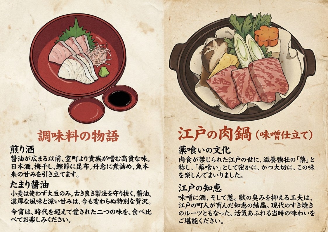 献立には、江戸末期の食文化を象徴する料理として味噌仕立ての「江戸の肉鍋」を用意しています。江戸では長く肉食が禁じられていましたが、滋養をつけるための「薬食い」として鹿や猪の肉を食べる文化がありました。幕末になると牛肉料理が広まり、味噌や酒、葱で臭みを抑えた牛鍋の文化が生まれます。この一膳仕立てでは、武家の饗応料理の文化に加え、江戸の町人文化の味も体験できる構成となっています。