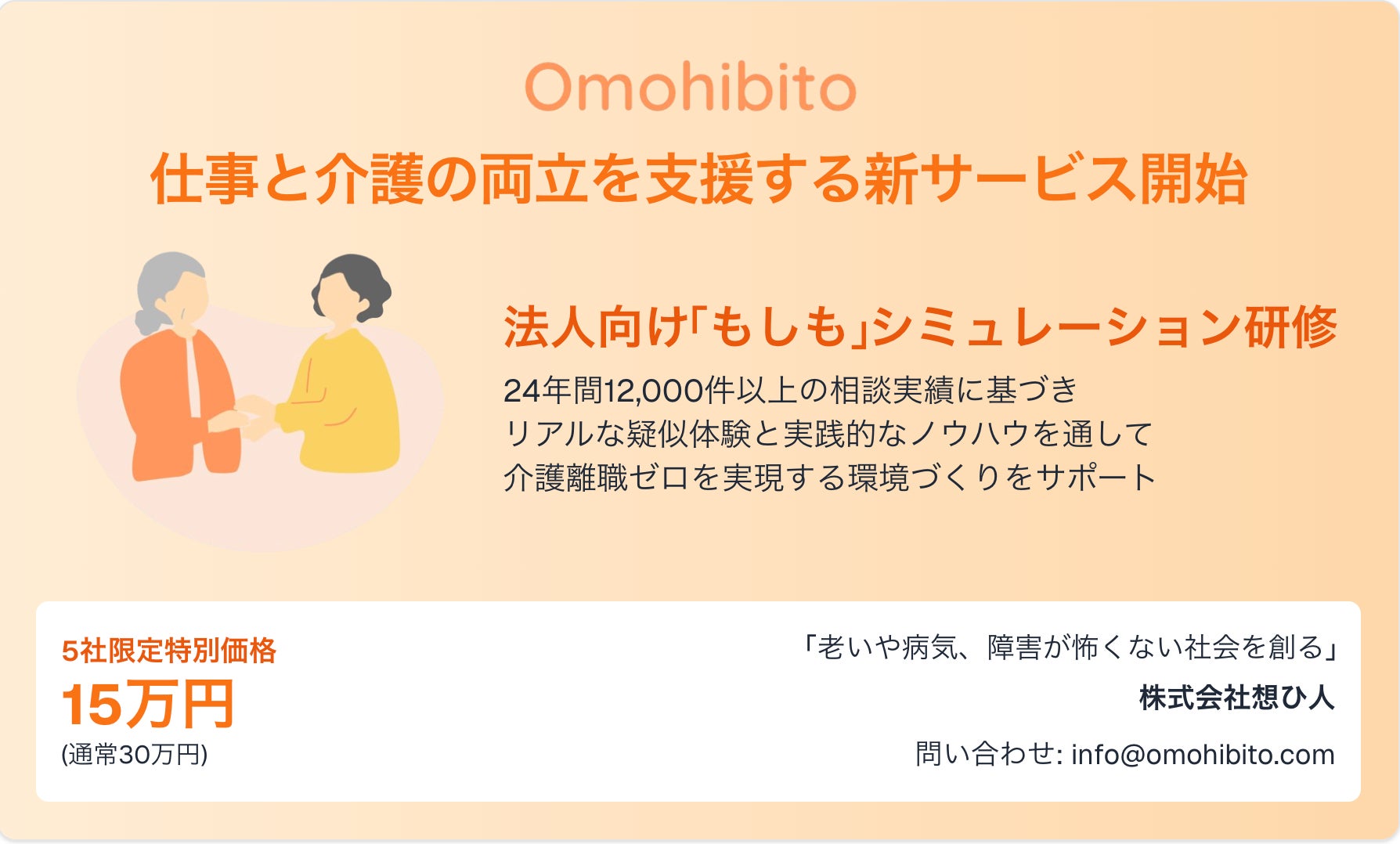 株式会社想ひ人(本社:東京都中野区、代表取締役:金子萌)は、仕事と介護の両立に悩む従業員とその家族を支援する法人向けパッケージ「想ひ人シニアコンシェルジュ」に、新たに「もしも」シミュレーション研修(商標申請中)を追加し、提供を開始いたしました。