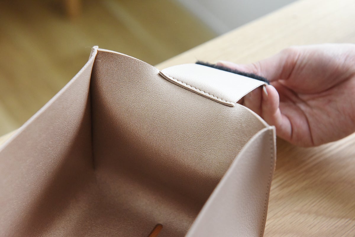 フェイクレザーのティッシュケース自体は珍しくありませんが、ブラック・ホワイト・ブラウンなどのシックな色味やビビッドカラーが主流。かっちりとした印象になりすぎたり、少し男性的な雰囲気もあり、置き場所を選びがちでした。