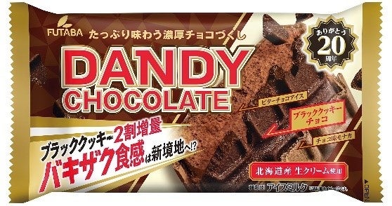 フタバ食品株式会社(本社:栃木県宇都宮市、代表取締役社長:齋藤貞大)が販売する、「驚愕のバキザク食感」と「チョコ感」が魅力の大容量チョコモナカアイス「ダンディー チョコレート」は、今年で20周年を迎えました。