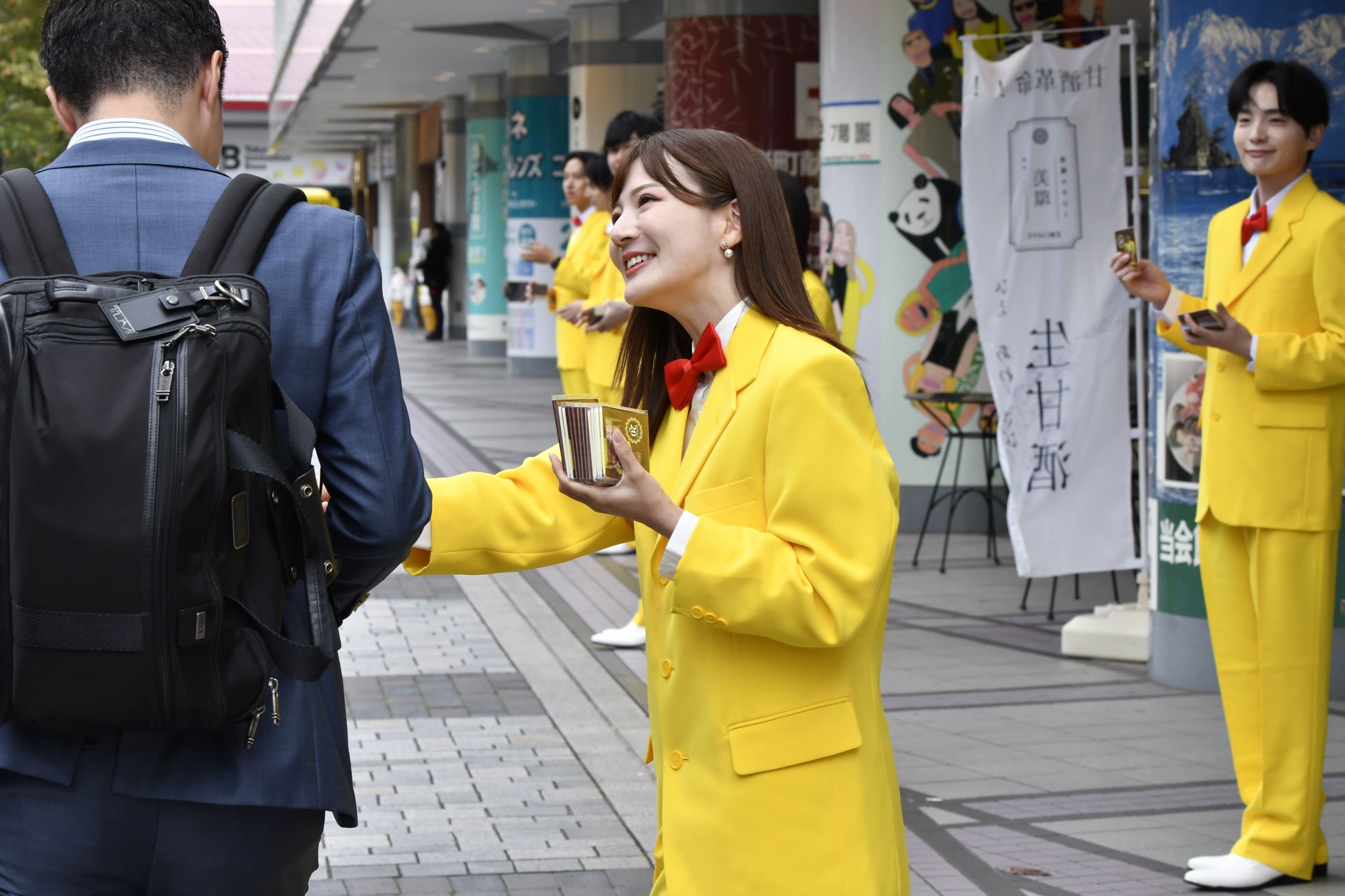 20周年を記念して、「ダンディー チョコレート」の商品名にちなんで、ダンディ坂野さんを中心に、ダンディ坂野さんに扮した黄色スーツの総勢20名が、11月5日(火)に限定デザインの付箋を5,000個限定で配布するサンプリングイベントを実施しました。