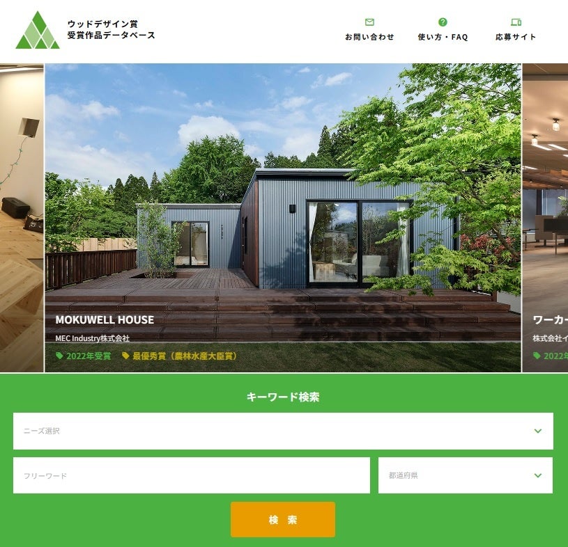 「木製品のプレゼントを探したい」といったニーズに応じたフィルタリングやキーワード検索が可能で、商品購入のための関連情報も掲載されています。また、木を巧みに活かした暮らしに彩りや癒しをもたらす建築・空間や家具など、優れた受賞作品をご覧いただけます。