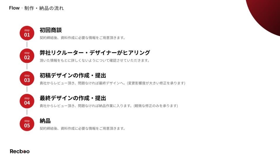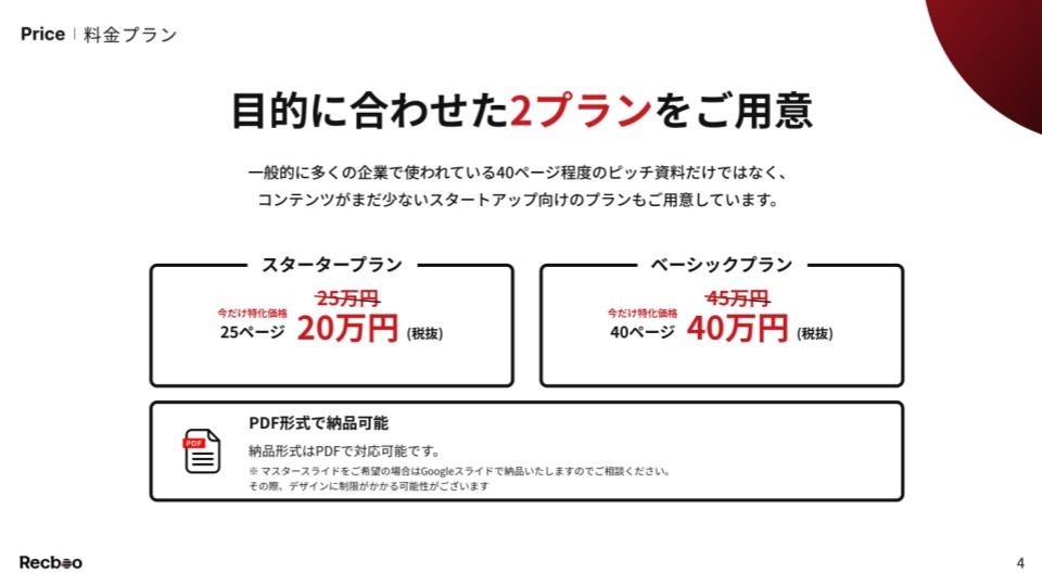 多くの採用ピッチ制作サービスが20ページにつき40万円程度という業界標準の価格を取っている中、『Recboo』はこの価格を大きくカットし、約半額で同等以上のクオリティの採用ピッチを提供します。