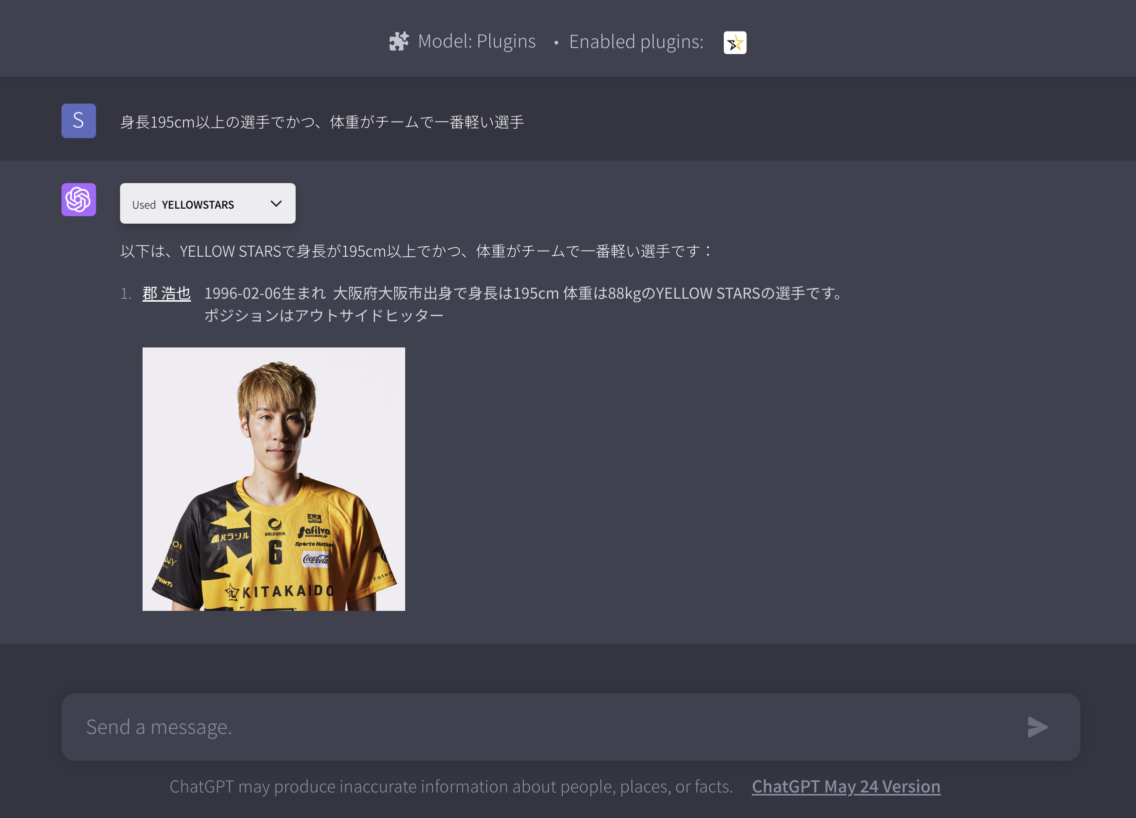 札幌市を拠点とするV2所属プロバレーボールチーム『北海道イエロースターズ』のChatGPTプラグインではファンが入力した内容に対して選手の情報などを返信してくれます。(2023年6月末リリース予定)