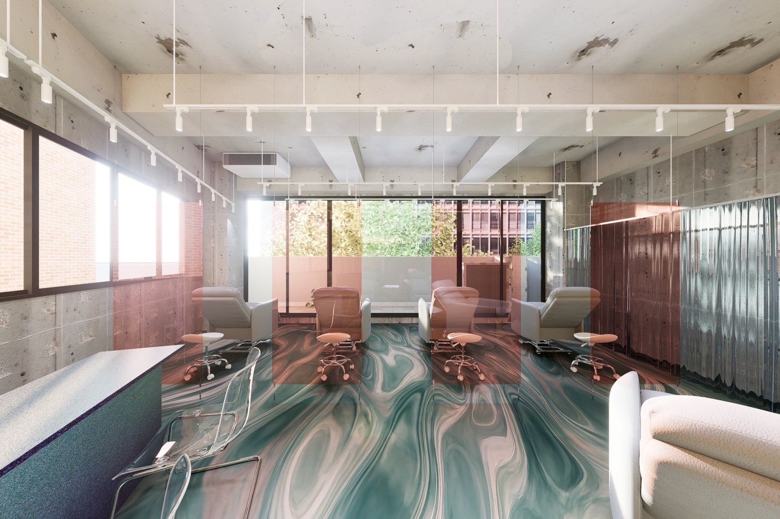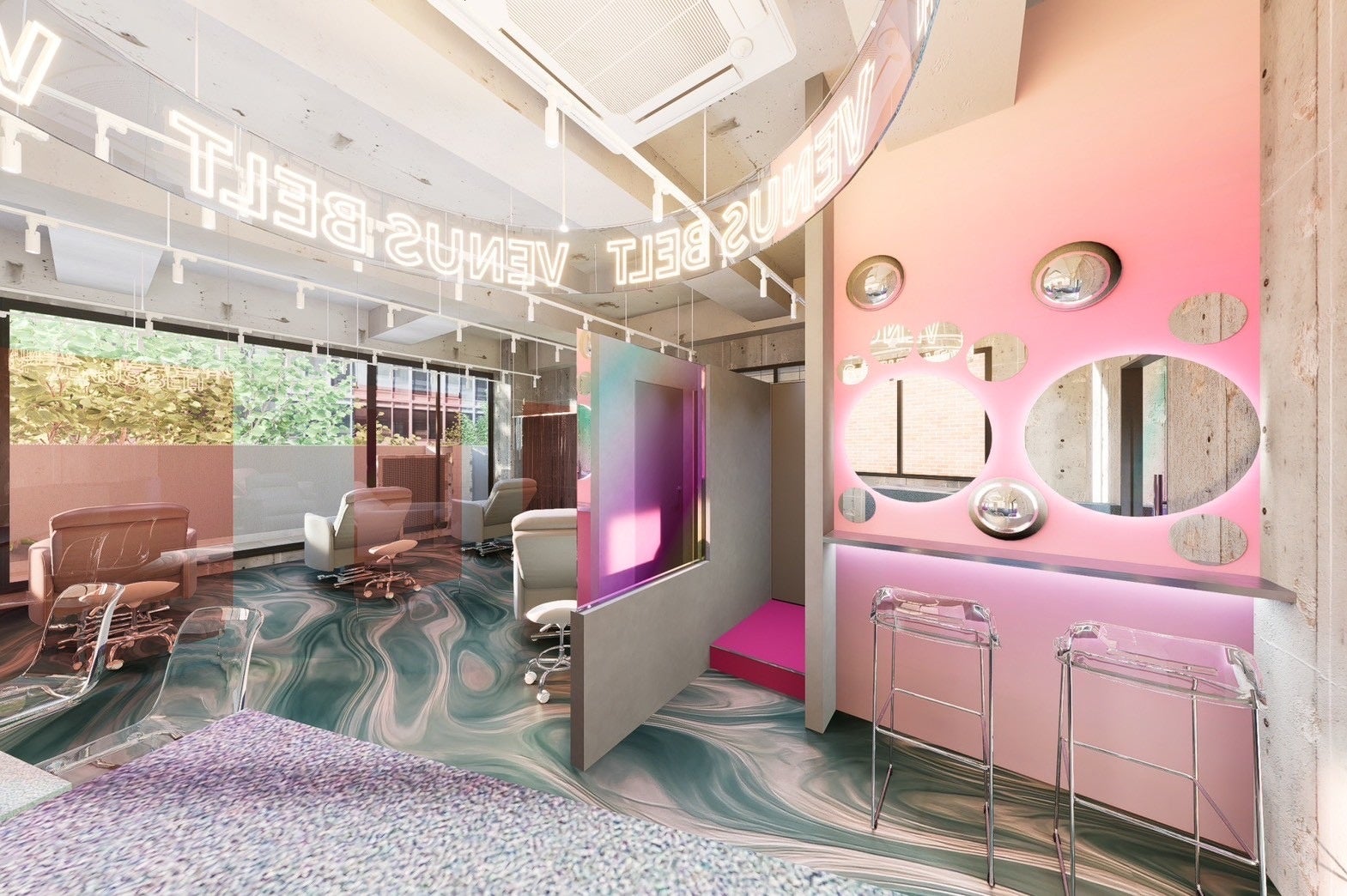 床にはインパクトのあるペイントアートが施され、アイネイルのブースを仕切るアクリルボードが印象的なアクセントに。ミラーやネオンなど異なる素材を組み合わせ、光の加減によって表情が変わる空間を演出しています。開放感のある店内にはネオンサインが輝き、近未来的で遊び心あるデザインとなっています。