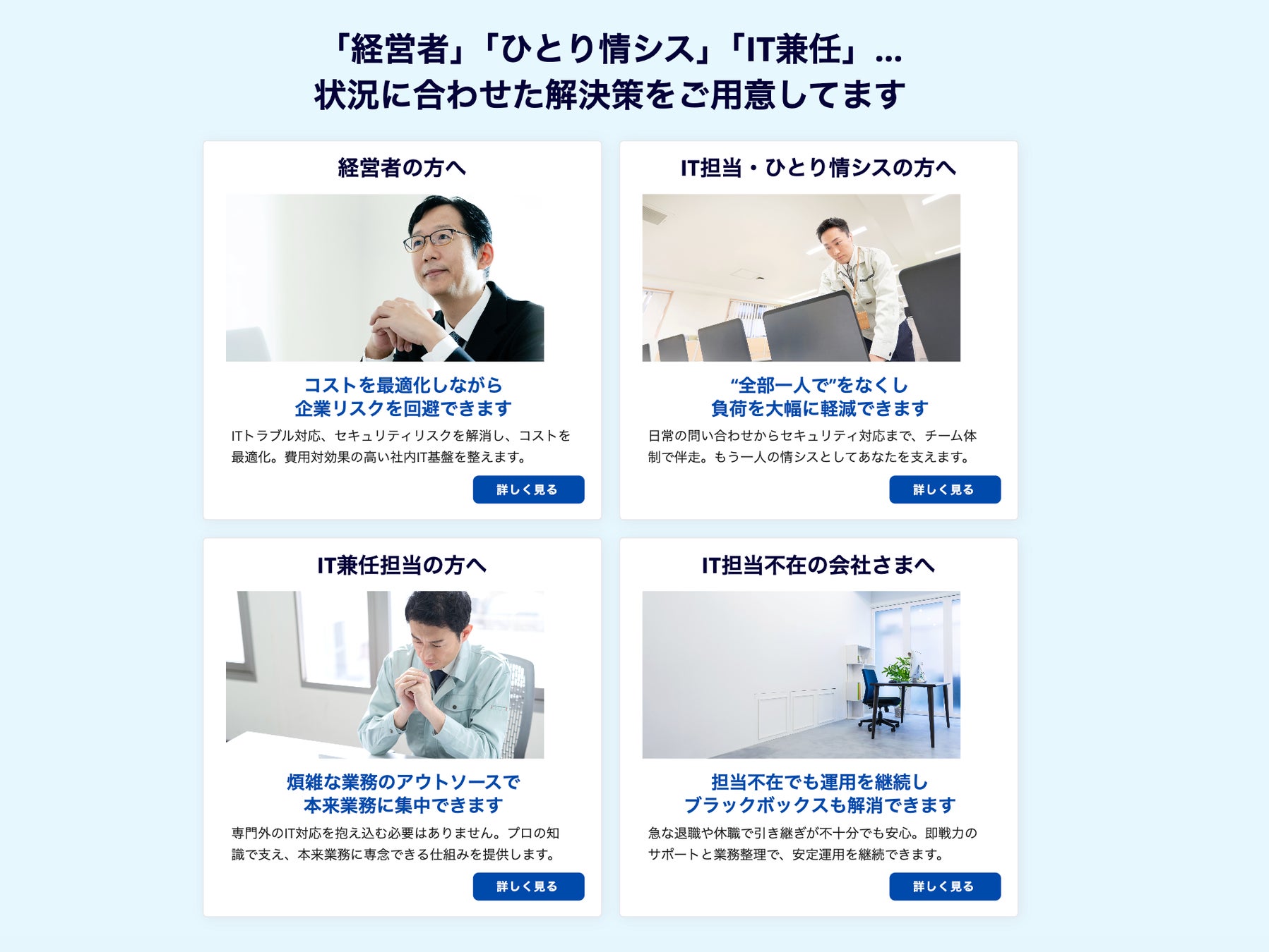 また、併せて企業が直面するIT課題の状況、立場や役割に合わせた「フレクシーサポート情報システム代行サービス」の解決策ページをフレクシーサポートの公式ウェブサイトに公開しました。このたび新たに公開した「解決策ページ」は、企業が直面するIT課題の状況、立場や役割に合わせて最適な支援内容を分かりやすく整理したものです。