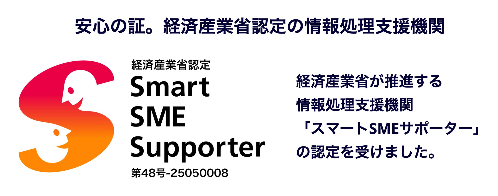 スマートSMEサポーター とは、経済産業省が定める「情報処理支援機関(認定制度)」の愛称です。中小企業・小規模事業者などの 生産性向上や業務効率化を支援するITツールやサービスを提供する専門家 を、一定の基準に基づいて認定する仕組みです。この制度により、企業は安心してIT導入や外部委託を検討でき、認定を受けた事業者は「信頼できるパートナー」として位置づけられます。当社がこの認定を受けたことは、IT支援における専門性・信頼性が認められた証です。