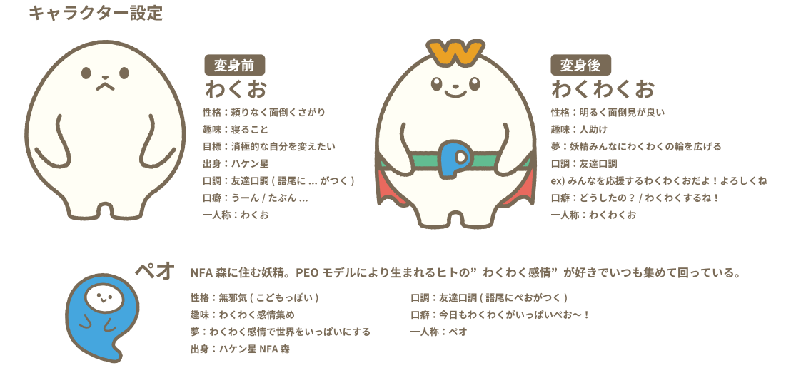 当社の「PEO型人材サービス」をより多くの会社や働く人たちに知っていただきたいとの想いを背景に、イメージキャラクター「わくお」「わくわくお」「ペオ」が生まれました。